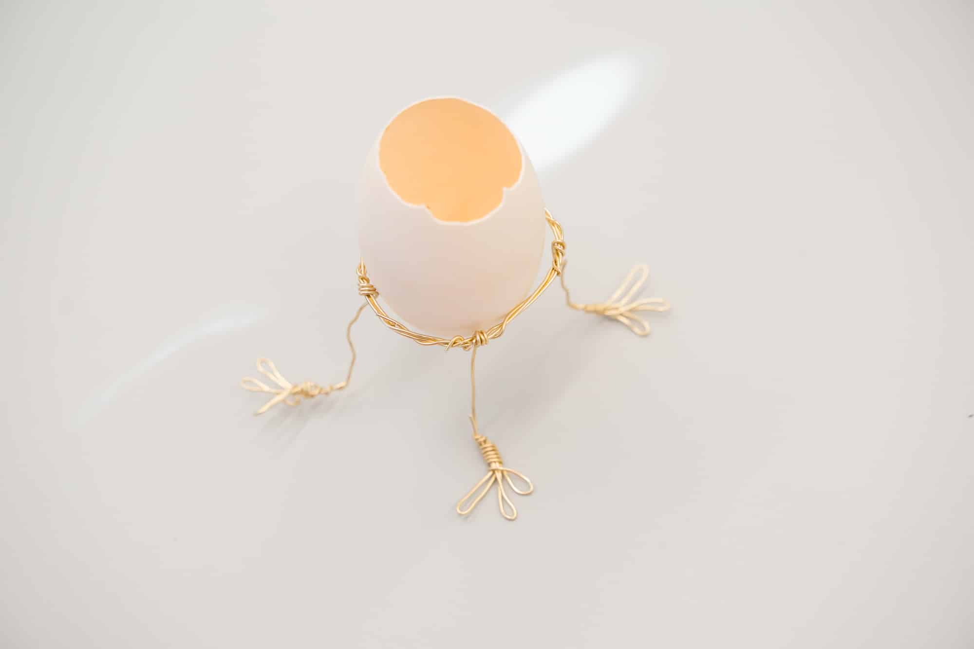 Befestige die Beinchen mit den Füssen am Drahtkreis und stelle das Ei in den Kreis-Halter ein.
