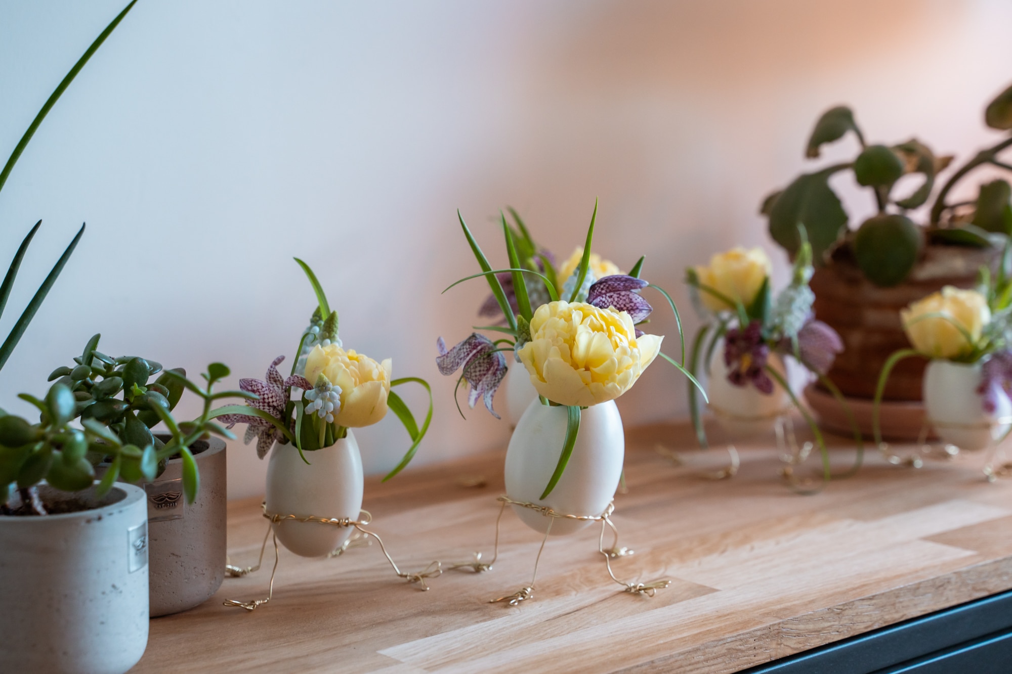 Fülle die Eier regelmässig mit Wasser auf, damit die Blumen länger halten. Verwelkte Blumen können auch ausgewechselt werden.