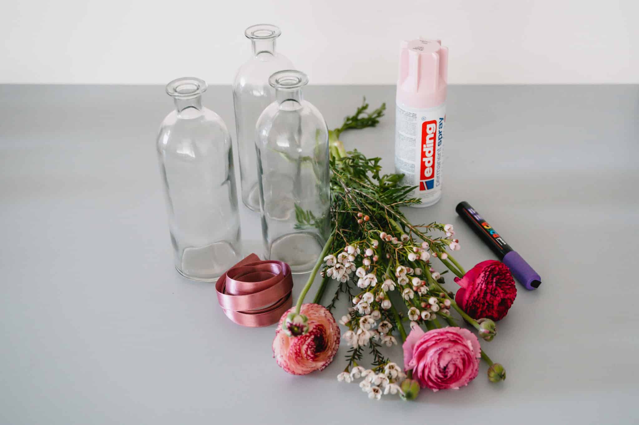 Binde bei jeder Vase noch eine Masche um den Flaschenhals.