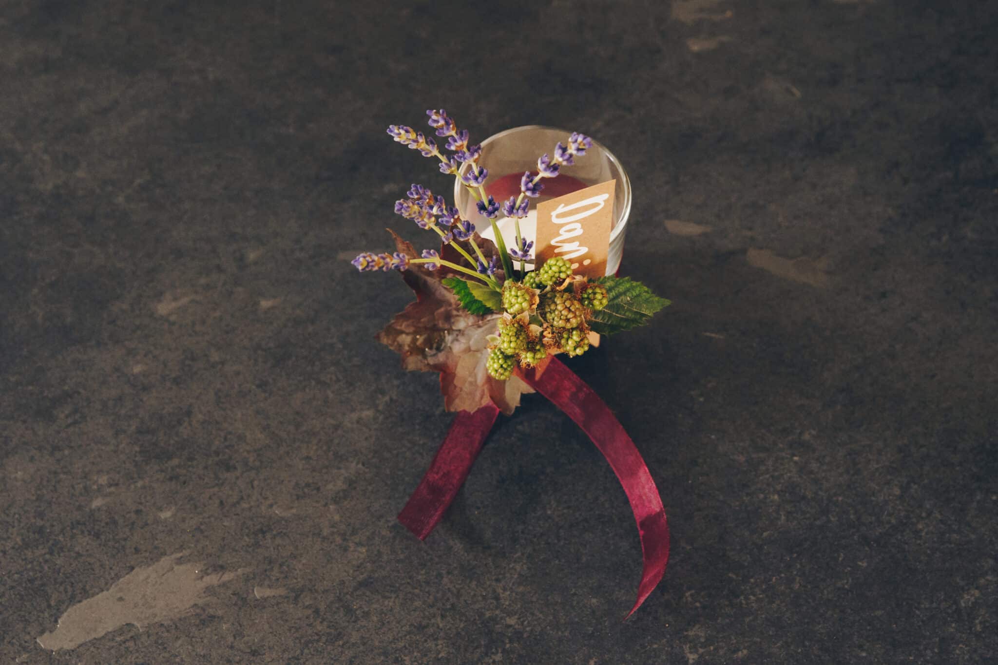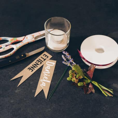Befestige das Sträusschen mit einem Stück Band am Glas.