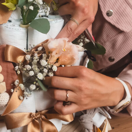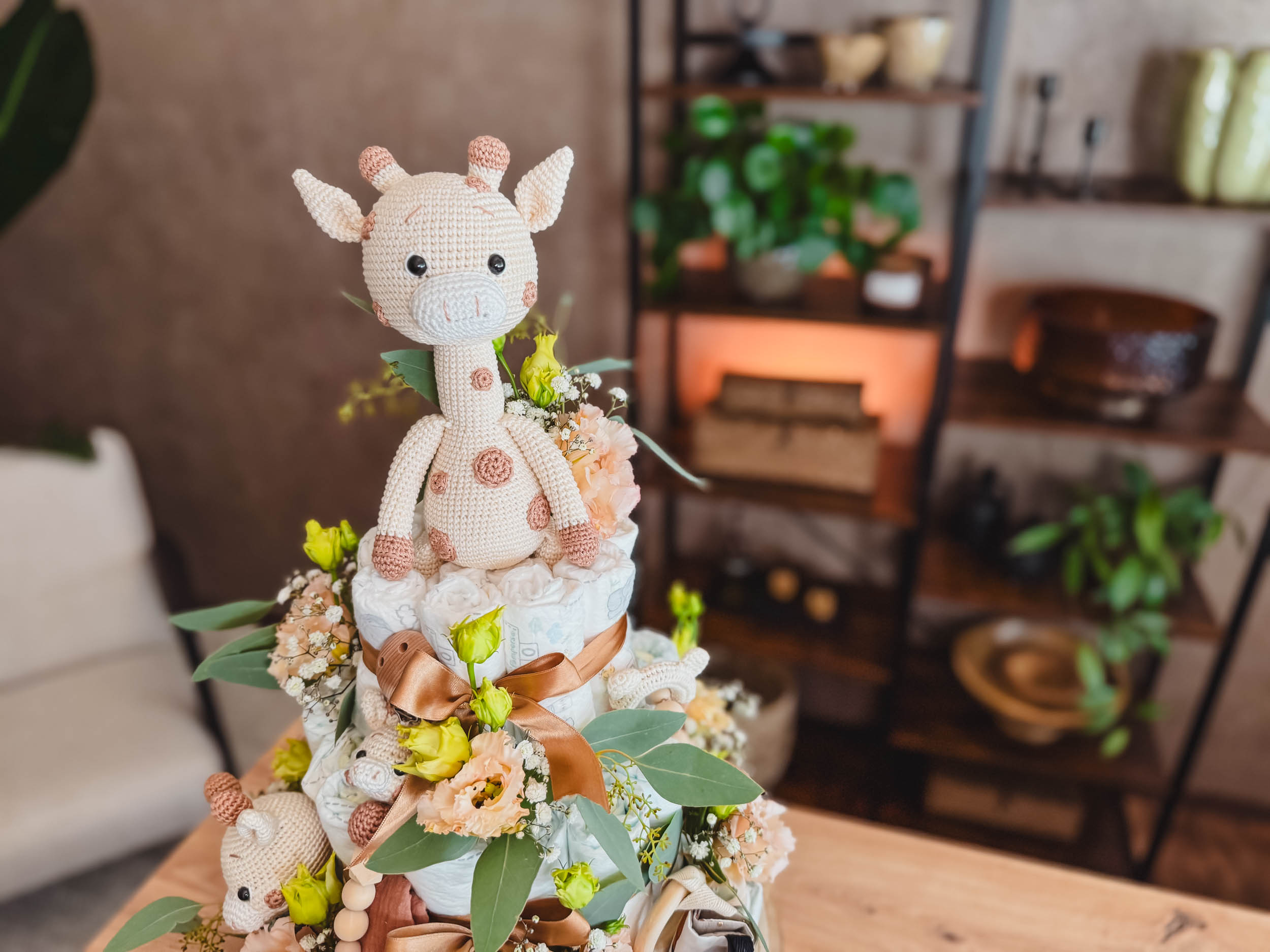 Jetzt kommt der schönste Teil: Dekoriere deine Windeltorte liebevoll mit Babyartikeln. Platziere z. B. ein Kuscheltier als Torten-„Topper“, stecke Rasseln, Socken oder Pflegeprodukte zwischen die Windeln und das Band.