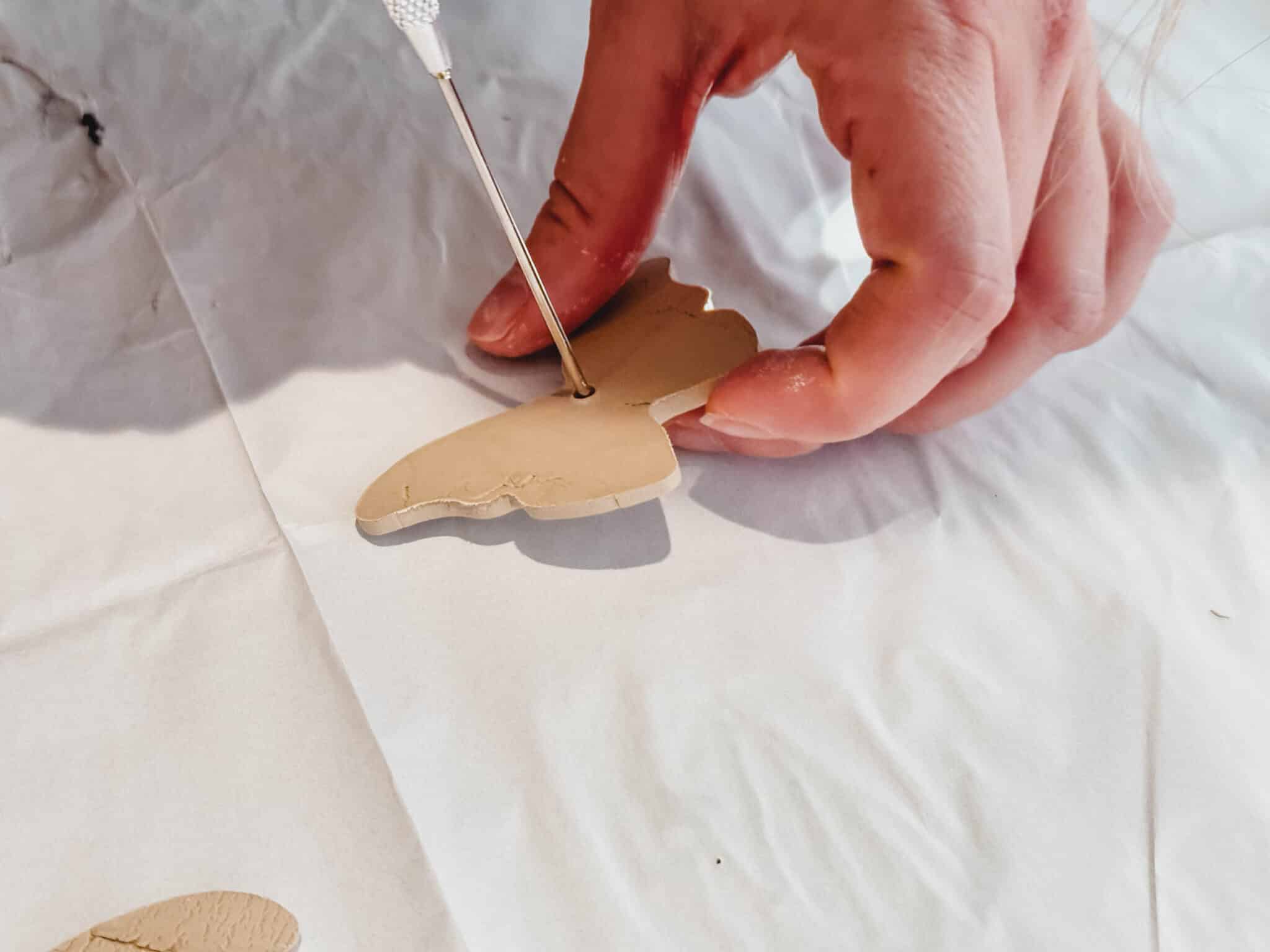 Stich mit einem Stift oder einem ähnlichen Gegenstand ein Loch in jedes Motiv. Achte darauf, dass es gross genug ist, damit du später problemlos ein Band zum Aufhängen durchziehen kannst.