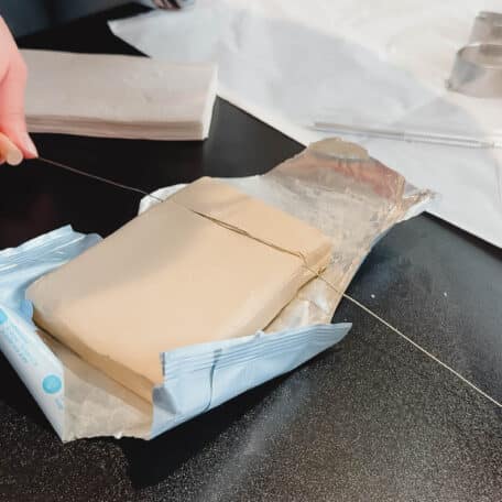 Schneide ein Stück Modelliermasse ab und rolle es mit einem Nudelholz oder ähnlichem auf die gewünschte Dicke aus.