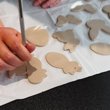 Stich mit den Ausstechformen so viele Motive wie möglich aus. Knete die Reste zusammen und wiederhole den Vorgang, bis du die gewünschte Anzahl an Anhängern hast.