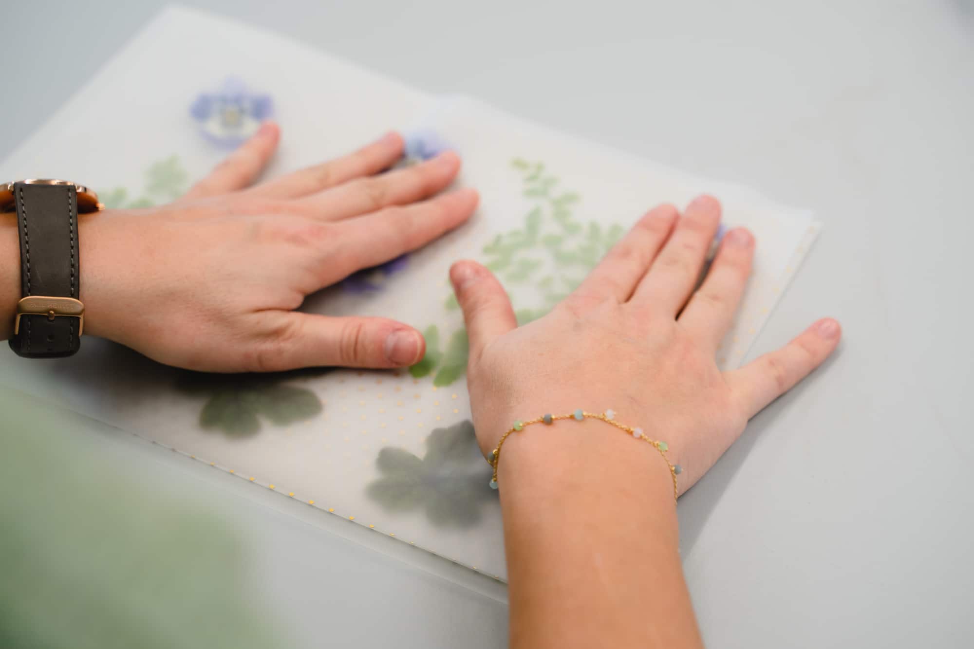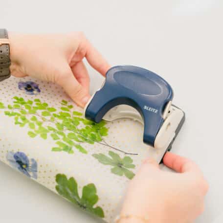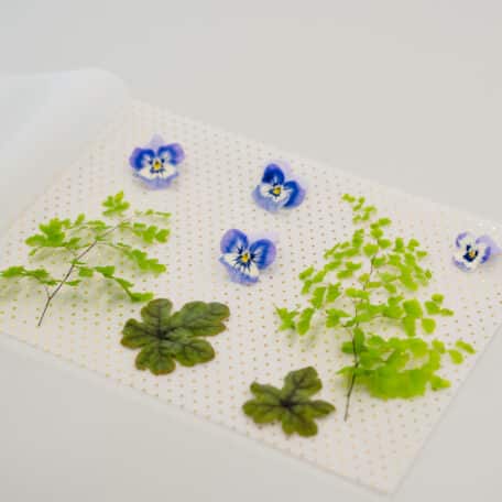 Auf der einen Seite das schöne Blatt Papier drauflegen und Blüten sowie Grün so verteilen, dass es attraktiv wirkt.