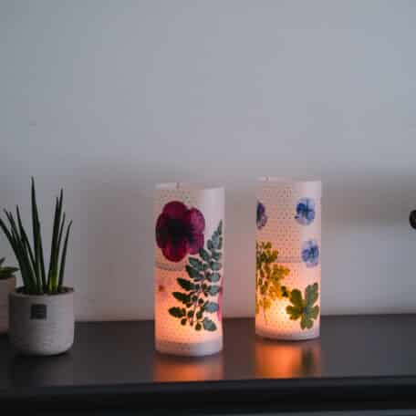 Stelle ein Teelicht in die Glasgefässe und stülpe die fertigen Bilder darüber.