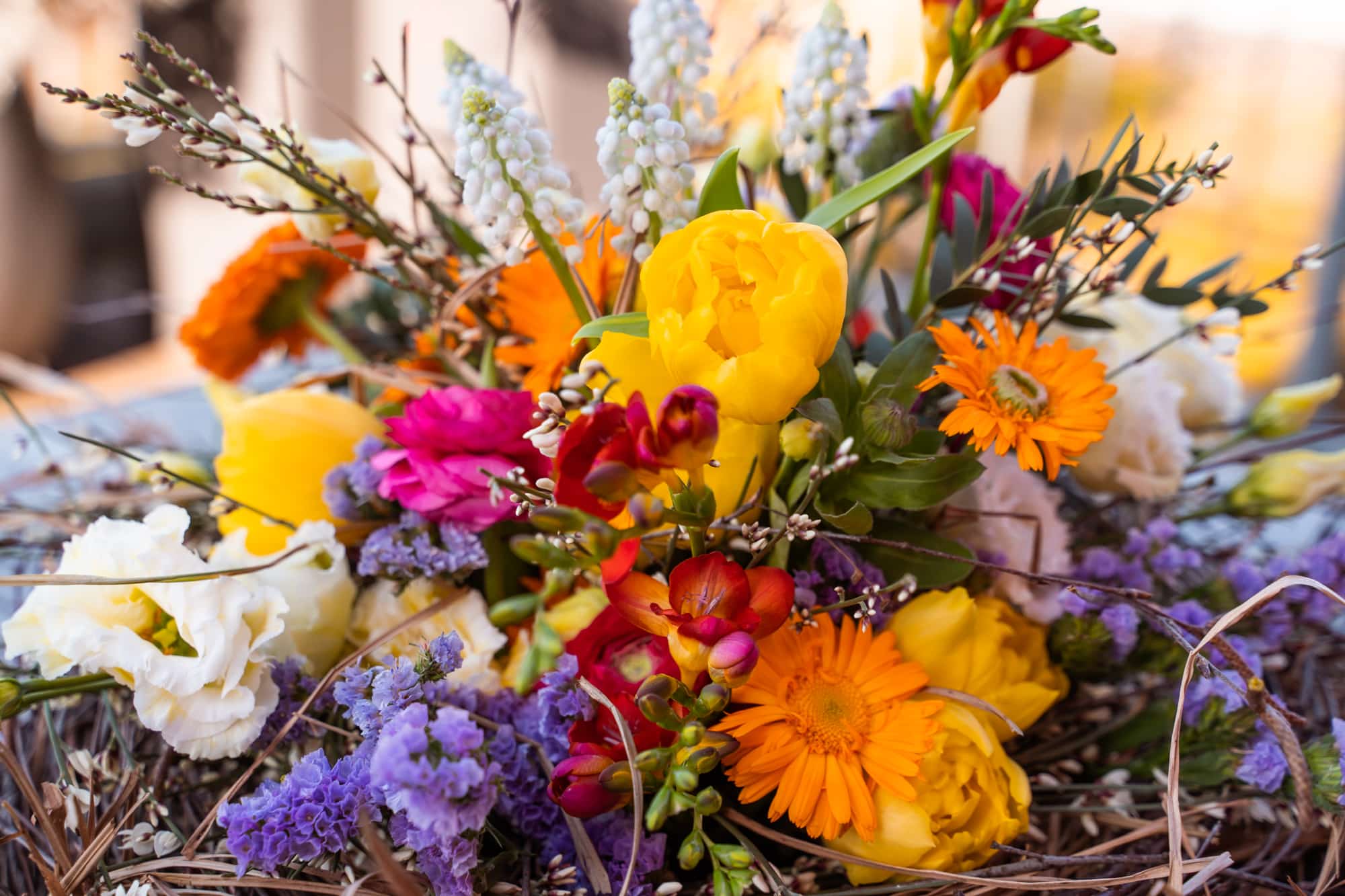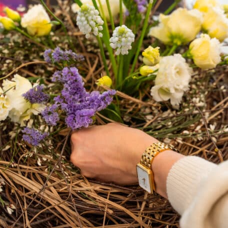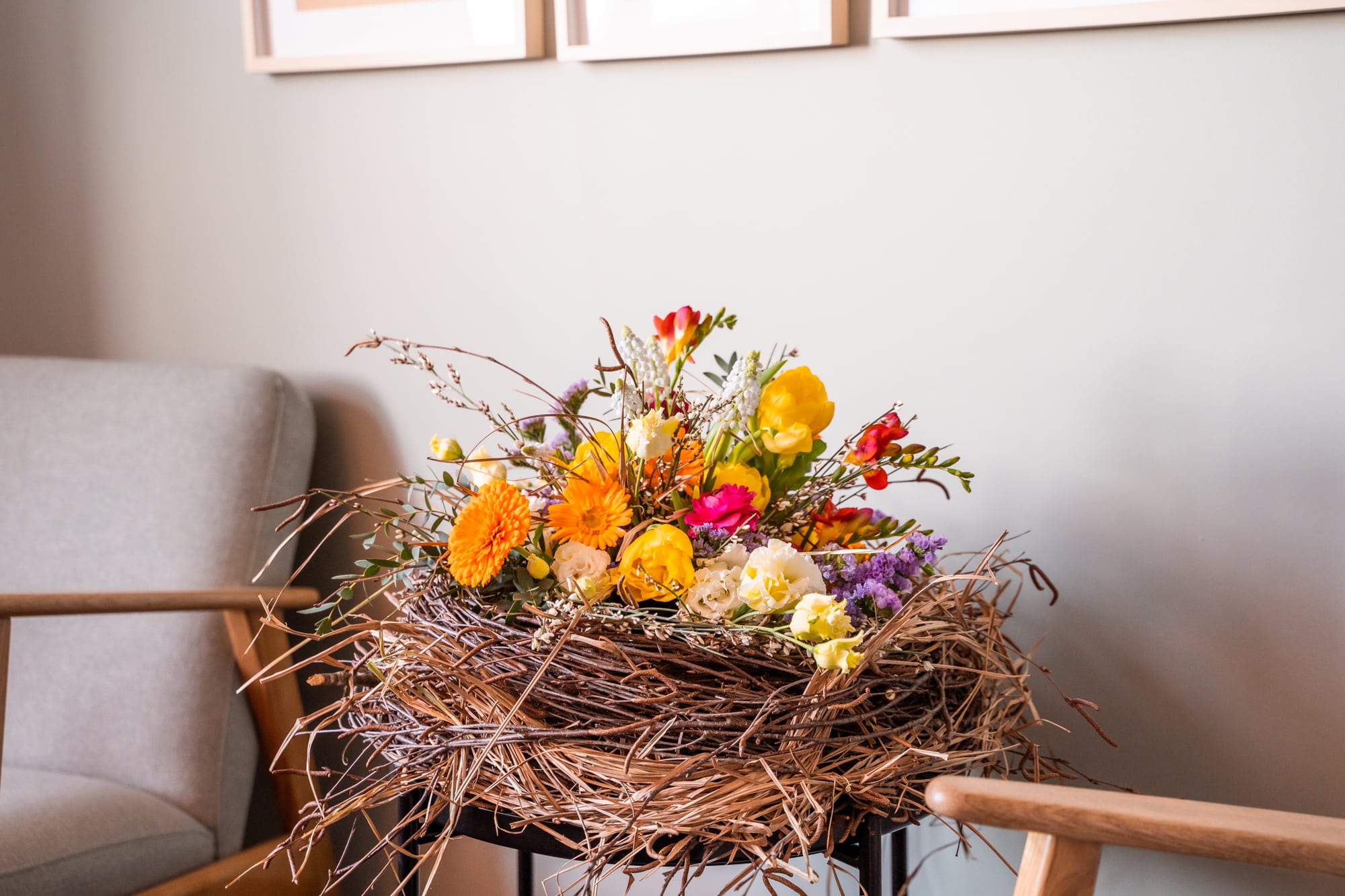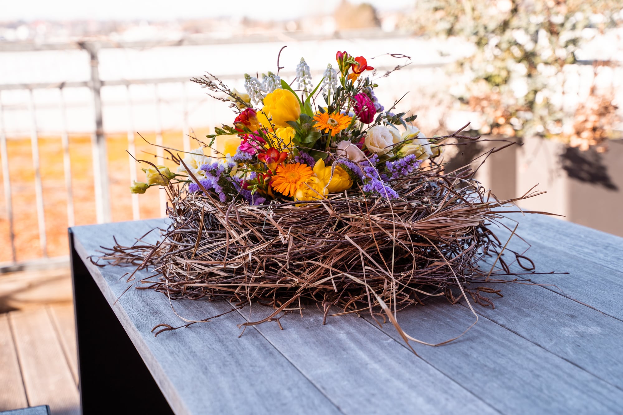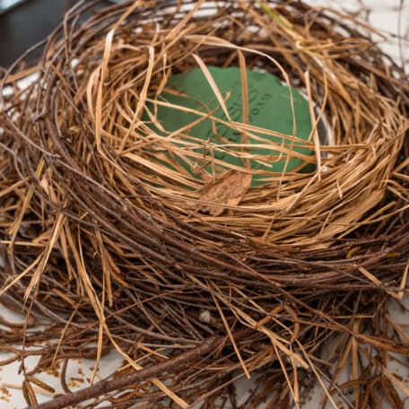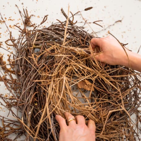 Stelle den Oasis Steckschaum samt Plastikgefäss ins Nest und winde weitere Gräser und Zweige darum, damit es richtig voll und schön wirkt.