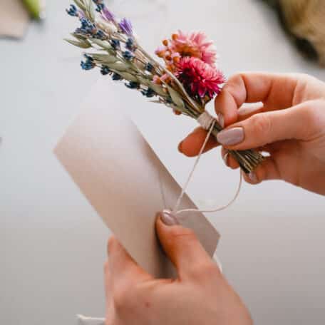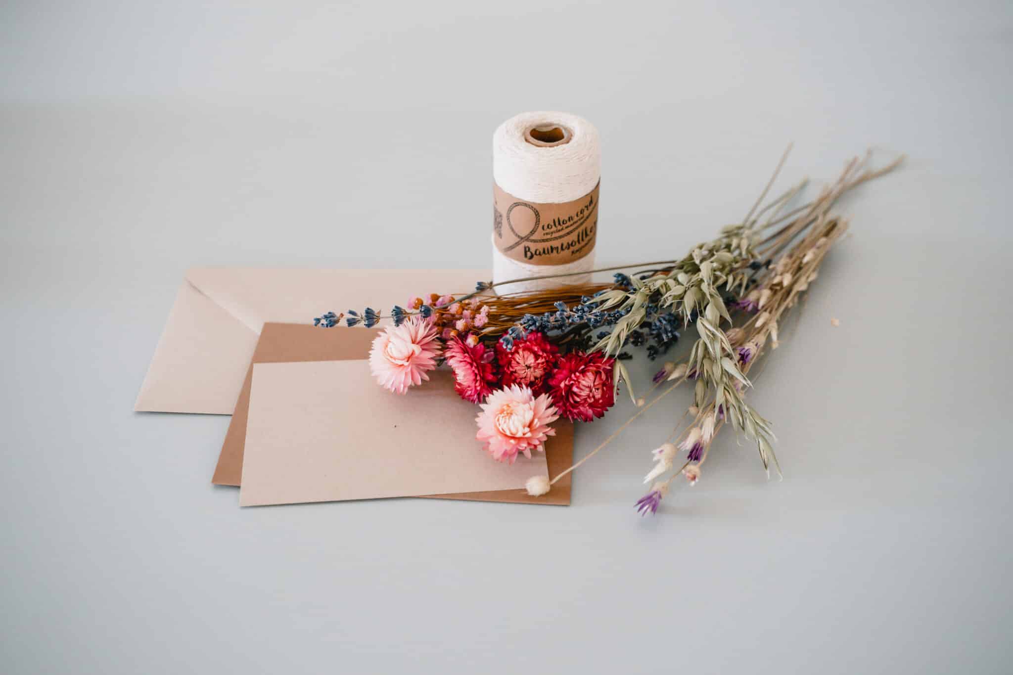 Binde die Trockenblumen zu einem Sträusschen und lasse die Enden der Schnur stehen.