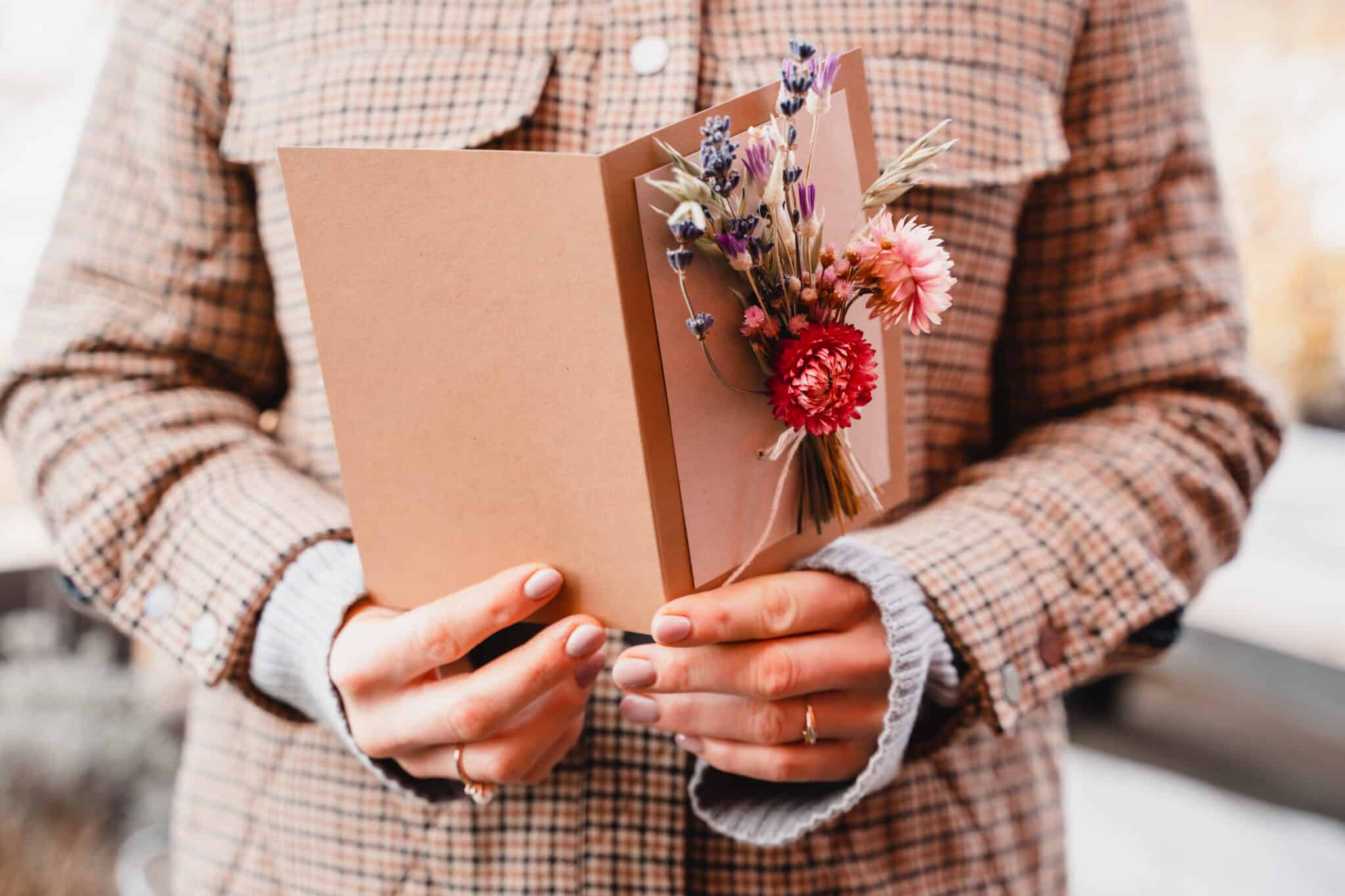 Versehe das Innere der Doppelkarte mit einem liebevollen Text. Klebe nun das Papier mit dem Sträusschen auf die Karte.