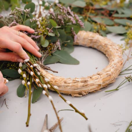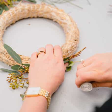 Aus dem natürlichen Material kleine Büschel machen, diese an den Strohreif legen, mit Draht umwickeln und straff anziehen. Achtung: Die Büschel sollten alle in die gleiche Richtung zeigen.