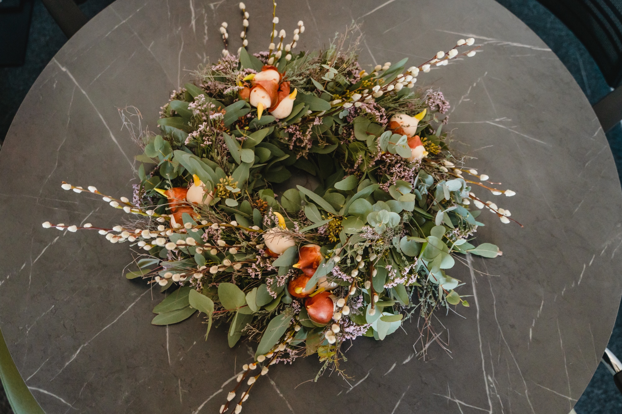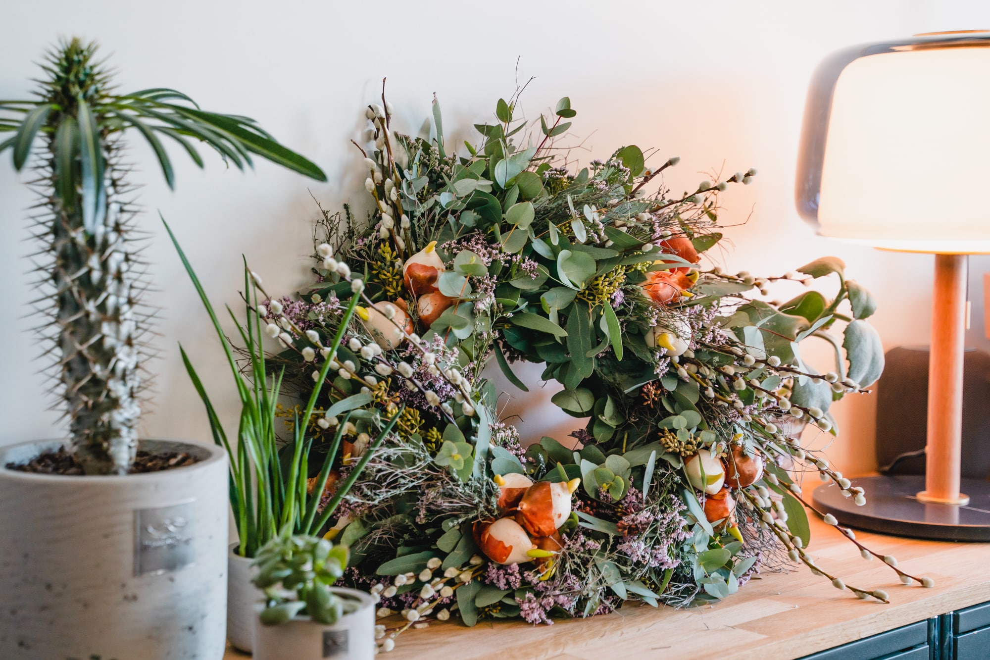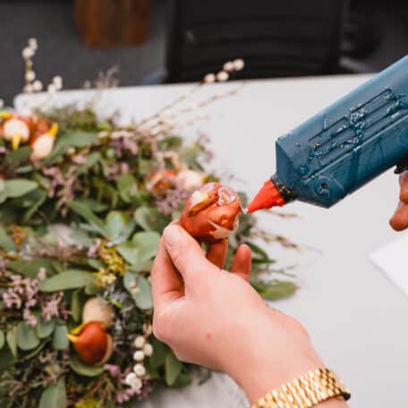 Zum Schluss dekoriere den Kranz noch mit Tulpenzwiebeln, die Du mit Heissleim festklebst.