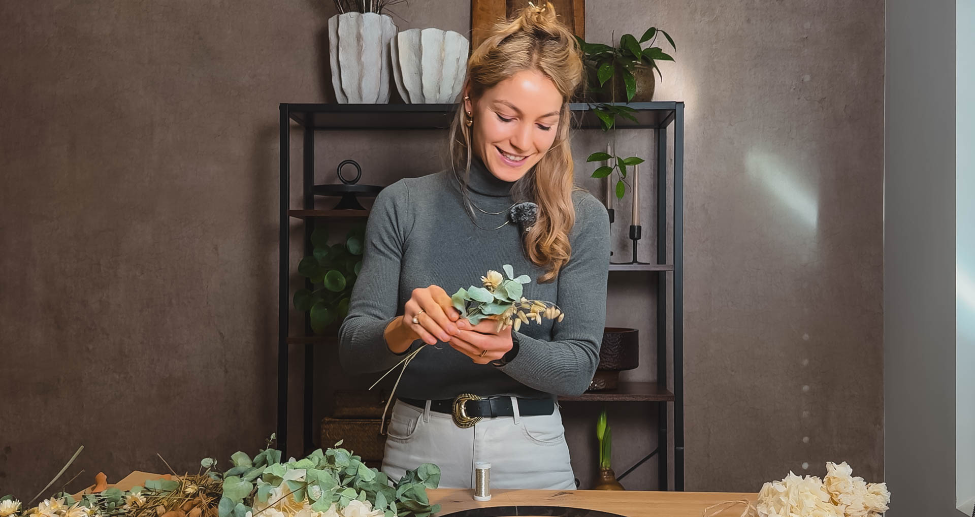 Man kann mit den Blumen einen Halbmond gestalten oder auch den ganzen Ring mit Trockenblumen umwinden.
