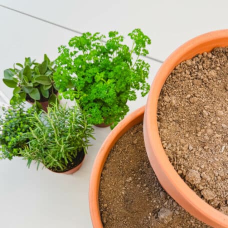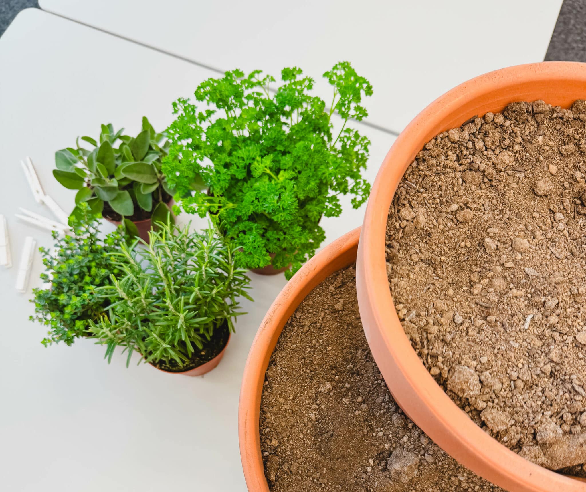 Versichere dich, dass die Kräuter genügend Wasser haben. Wer keine Wasserflecke möchte, kann einen Unterteller unter den grossen Topf stellen.