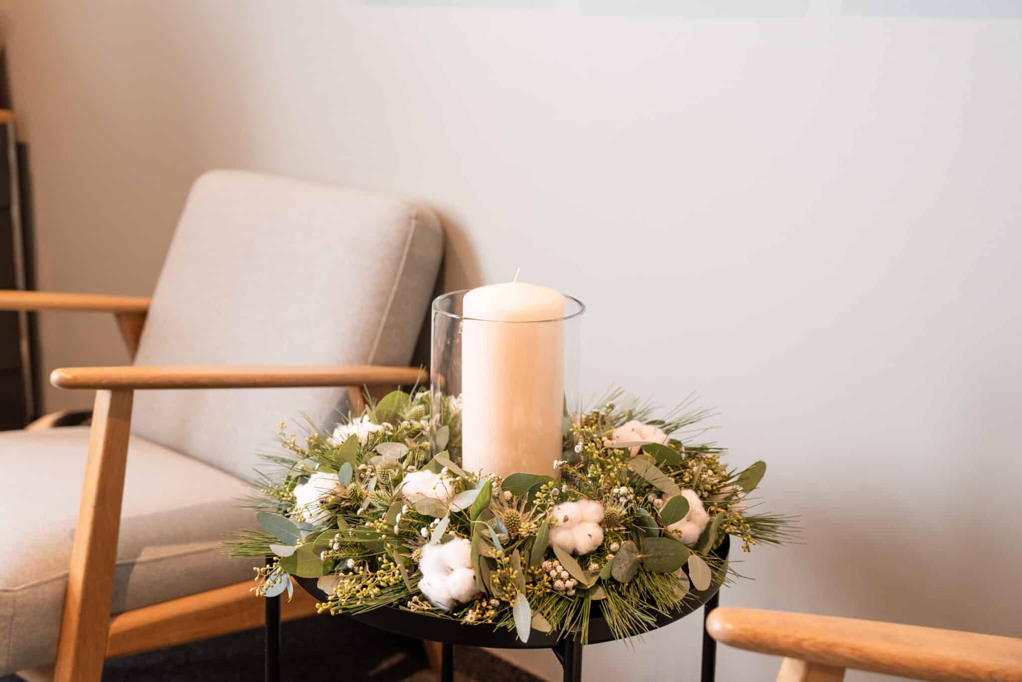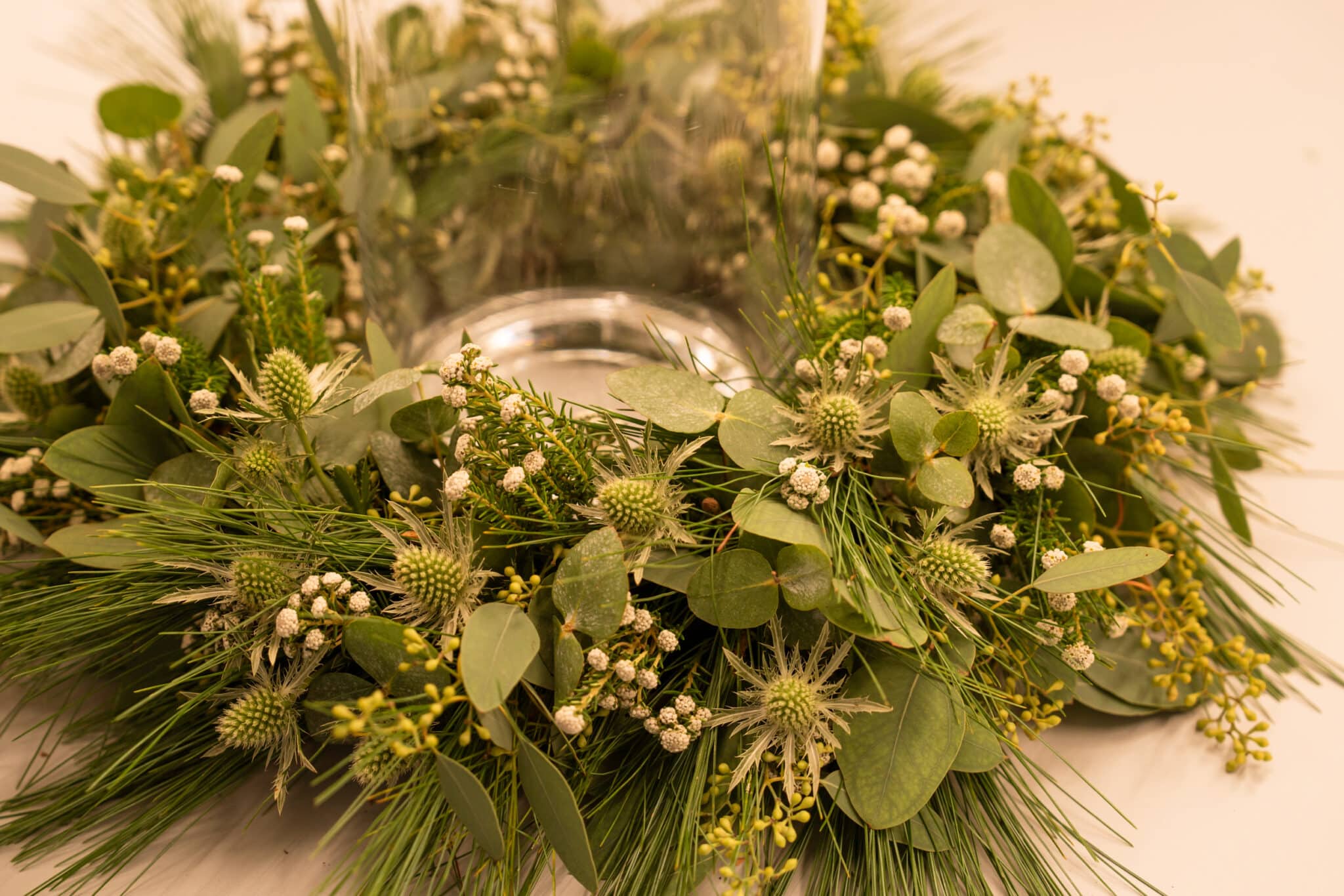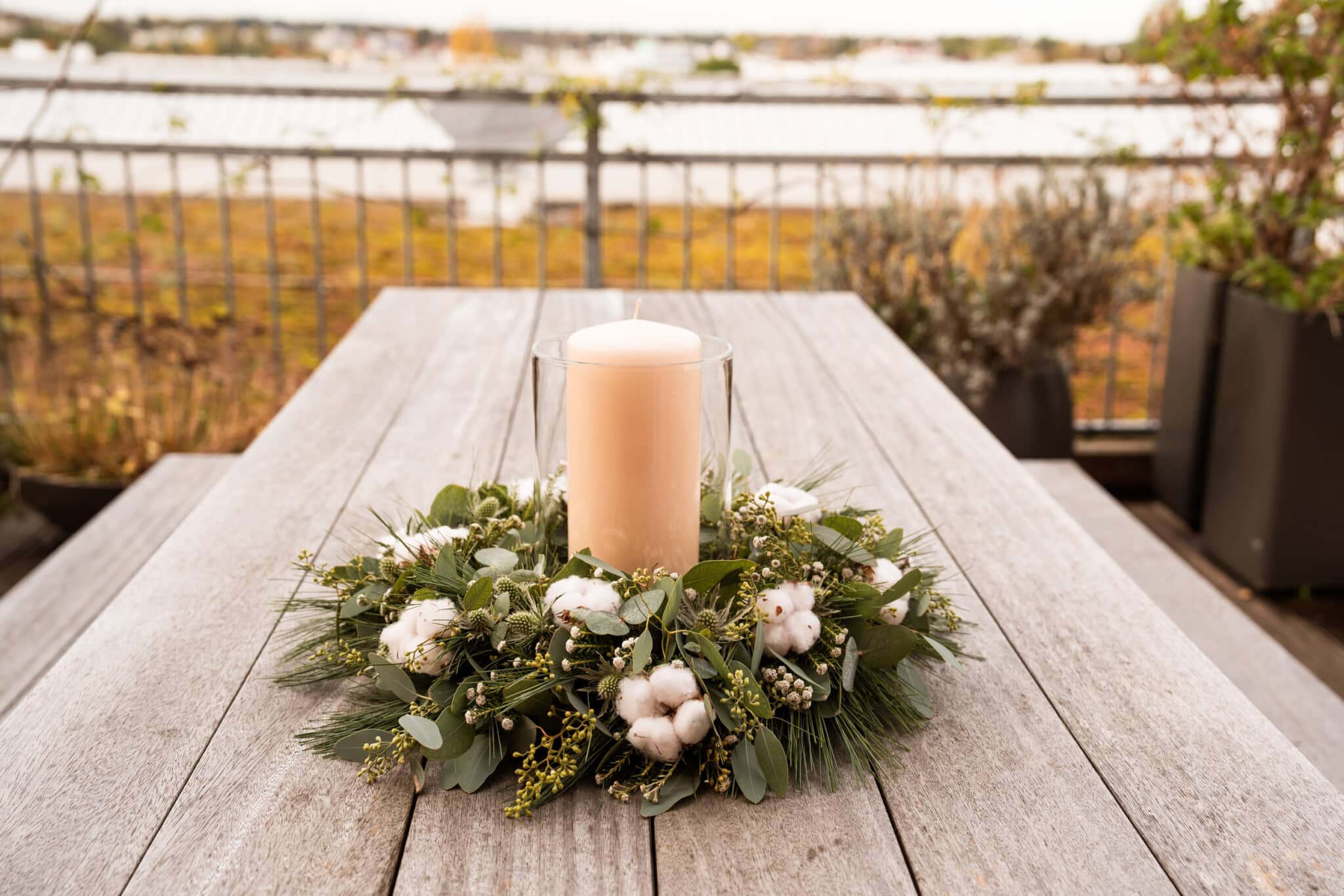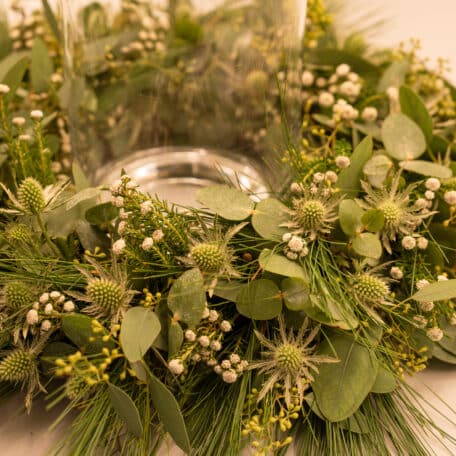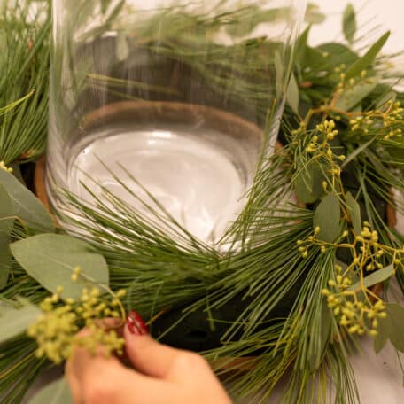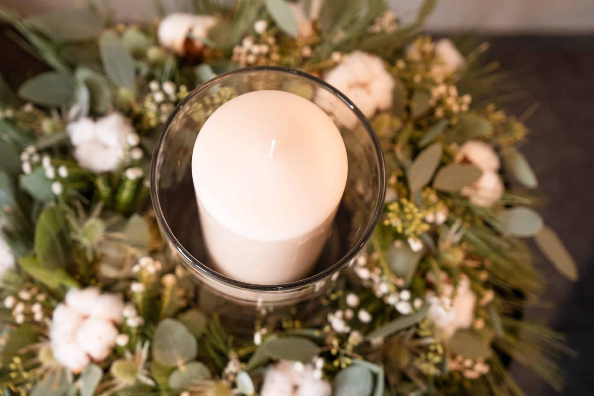 Stelle die Kerze in die Vase und das Ganze in die Mitte des Kranzes.