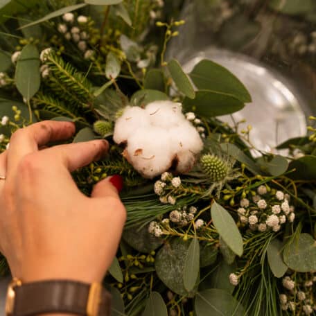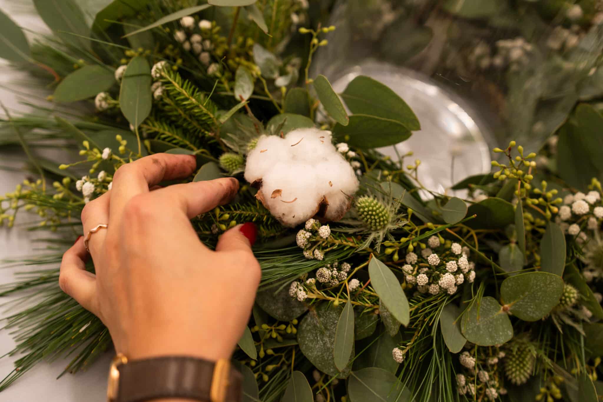 Versehe einige Baumwollblüten mit Draht und stecke auch diese in den Kranz.