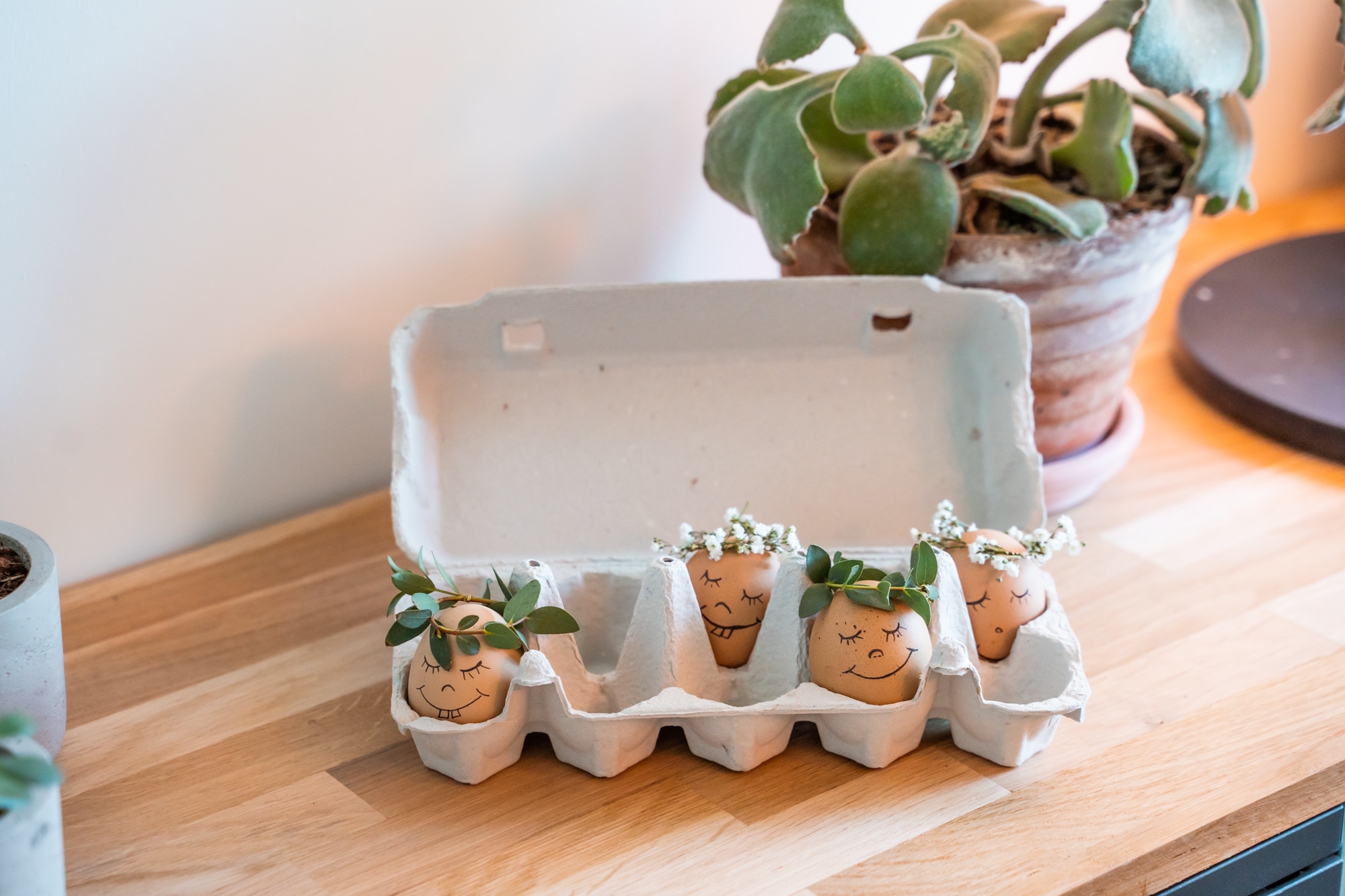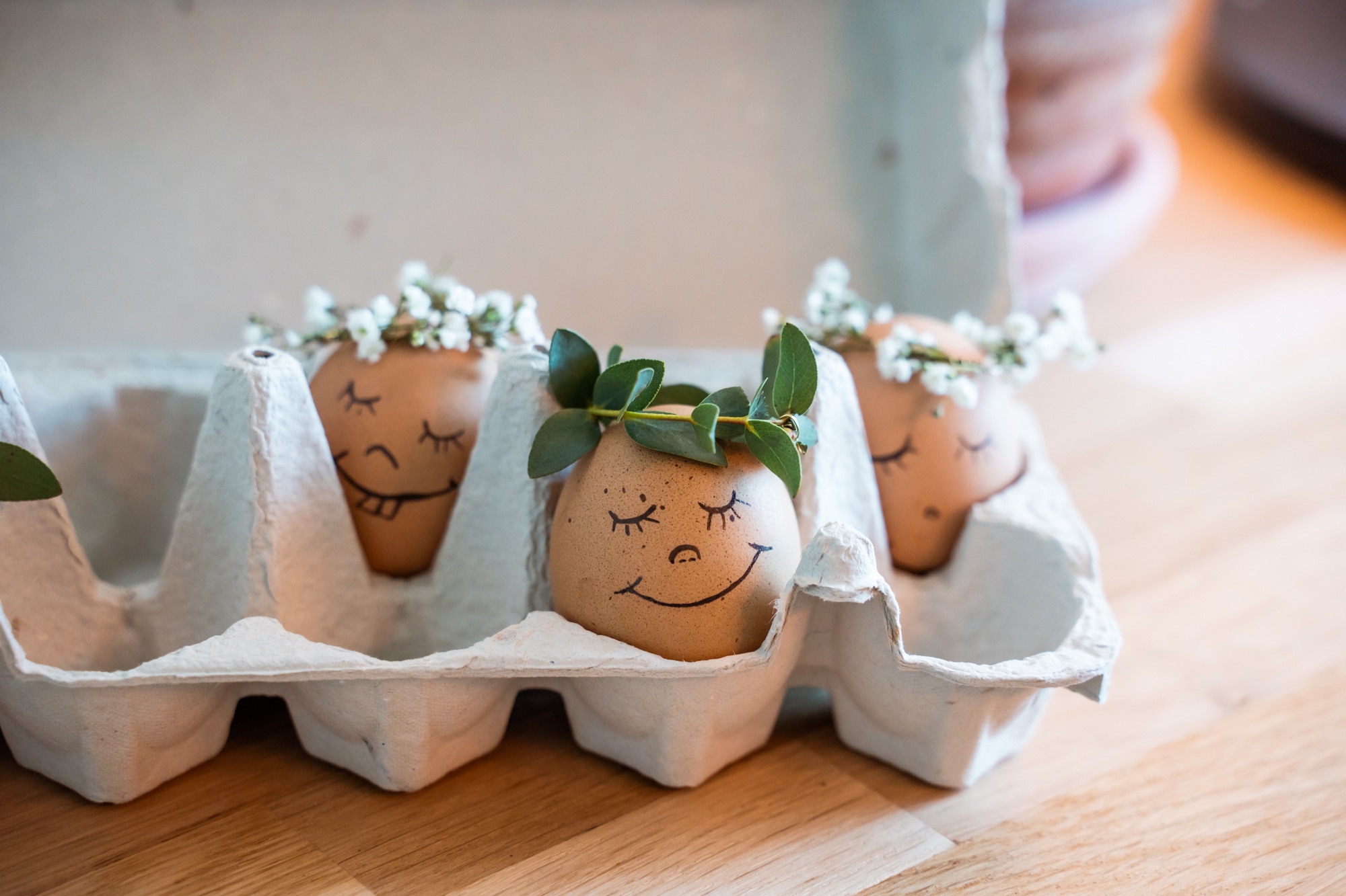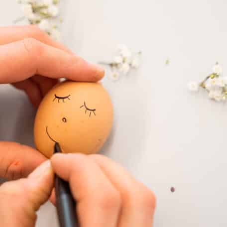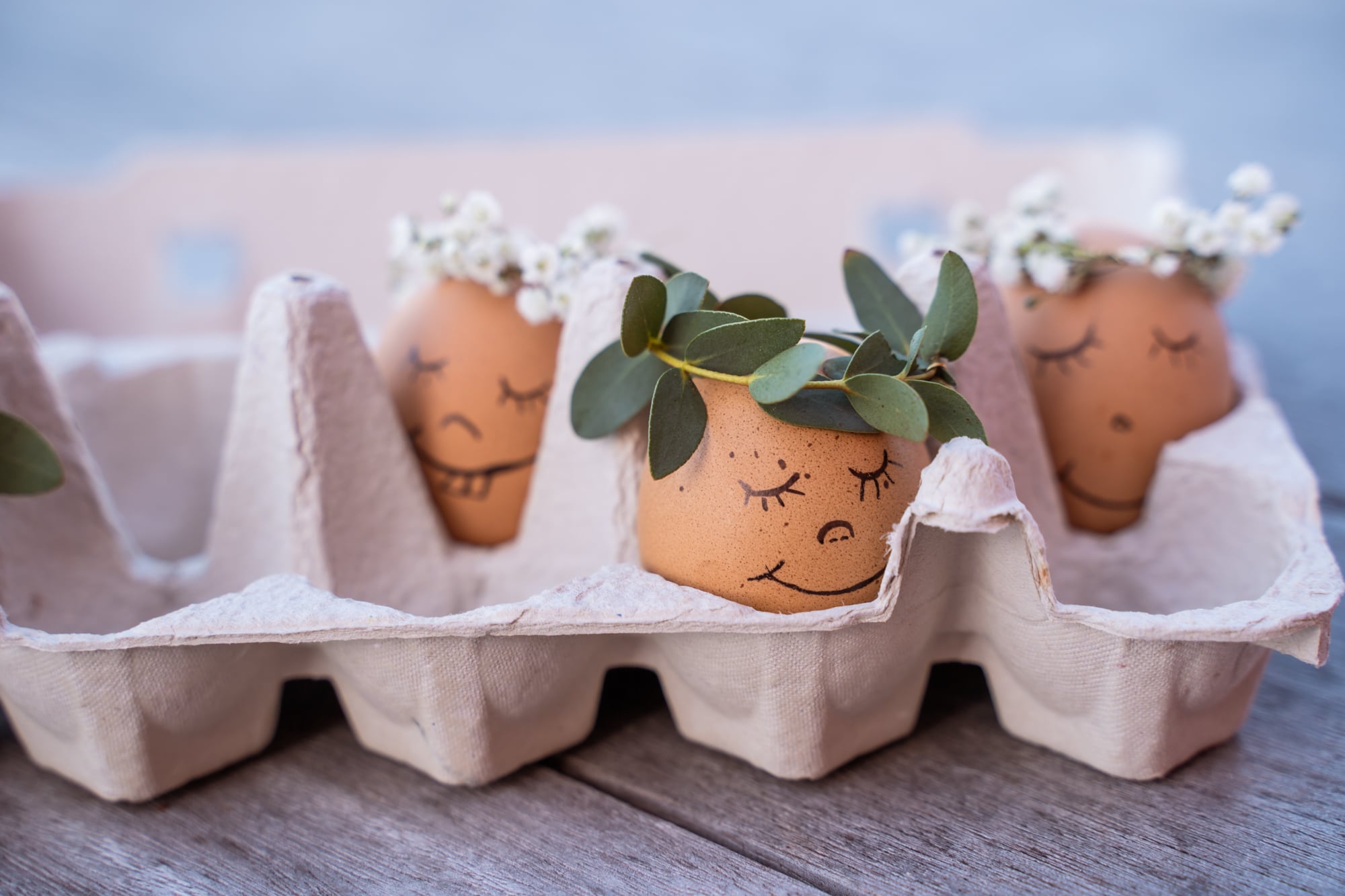 Male mit einem Stift kleine Gesichter auf die Eier und setzte ihnen dann die Krönchen auf, bevor du sie im Eierkarton platzieren.