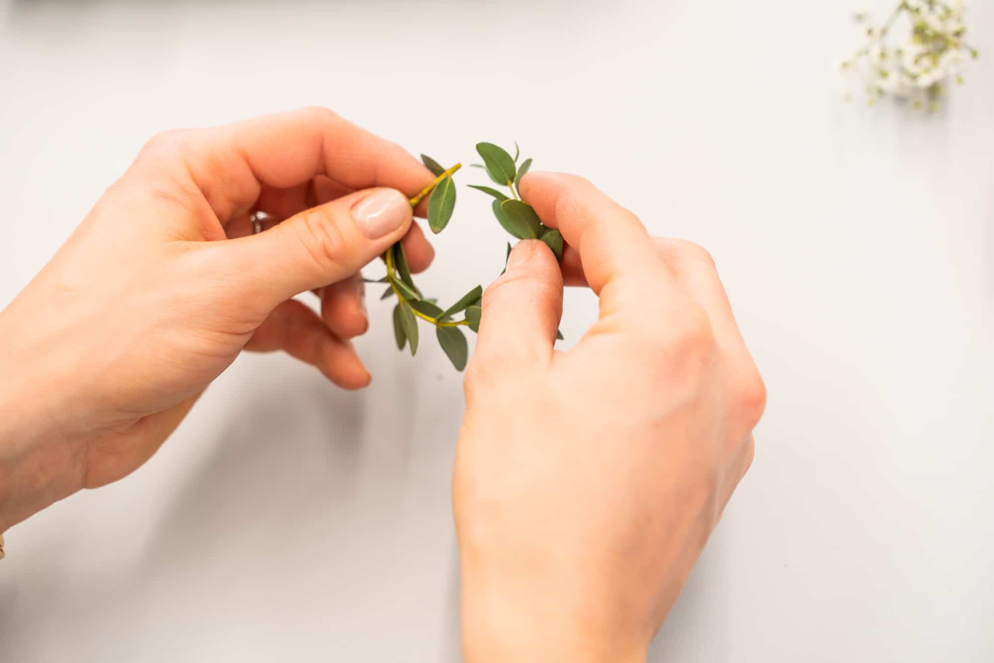 Für die Eukalyptus-Krönchen nehme einen längeren Eukalyptus-Zweig, forme diesen zu einem Kreis und fixiere diesen mit etwas Draht.