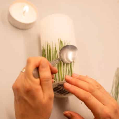 Erhitze über der Rechaud-Kerze den Löffel, platziere die Föhrennadeln auf der Kerze und fahre mit dem erhitzten Löffel darüber. Durch die Hitze erwärmt sich das Wachs, und die Nadeln bleiben kleben. Natürlich kannst du nur einige Nadeln aufs Mal bearbeiten.