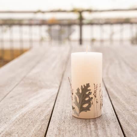 Presse im Vorfeld Blüten oder Blätter, welche du auf der Kerze anbringen möchtest. Gut gelingt es mit filigranen, dünnen Blüten oder Blättern.