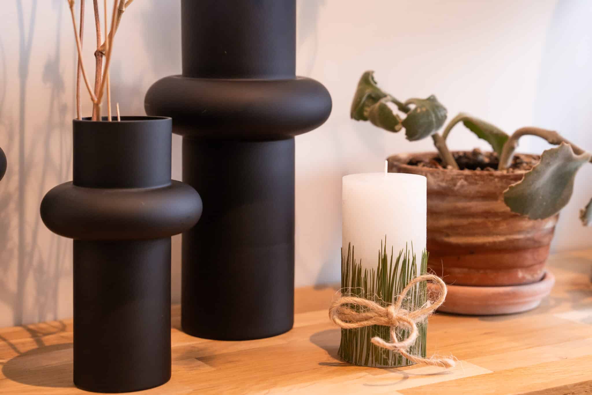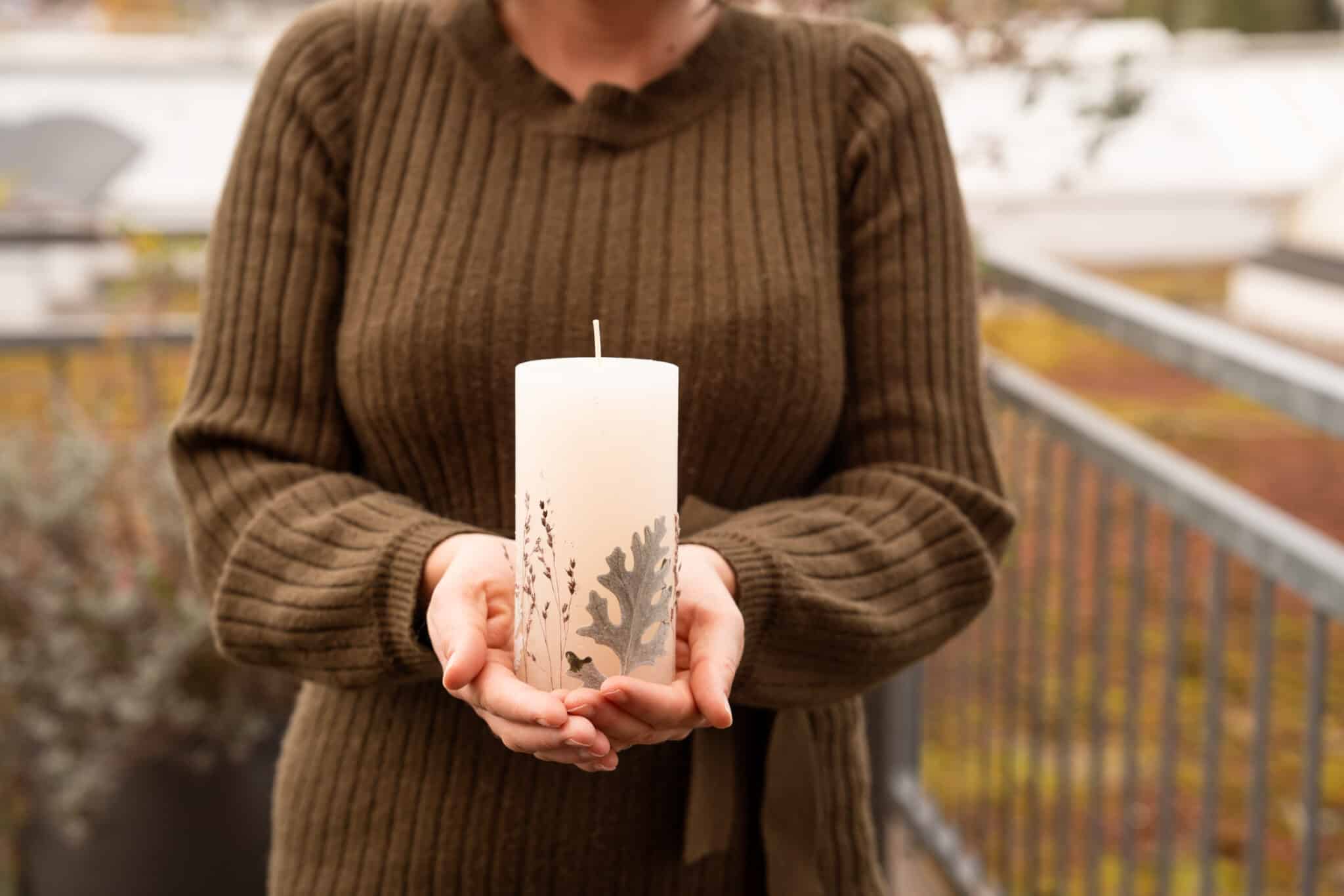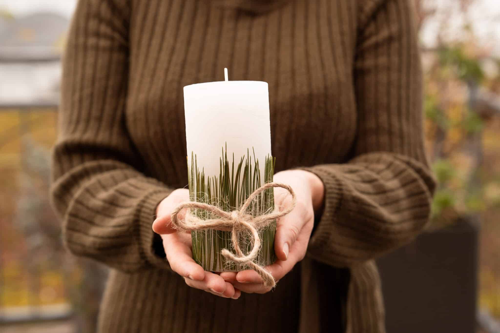 Schneide im Vorfeld die Föhrennadeln so zurecht, dass sie ca. 2/3 der Kerze bedecken.