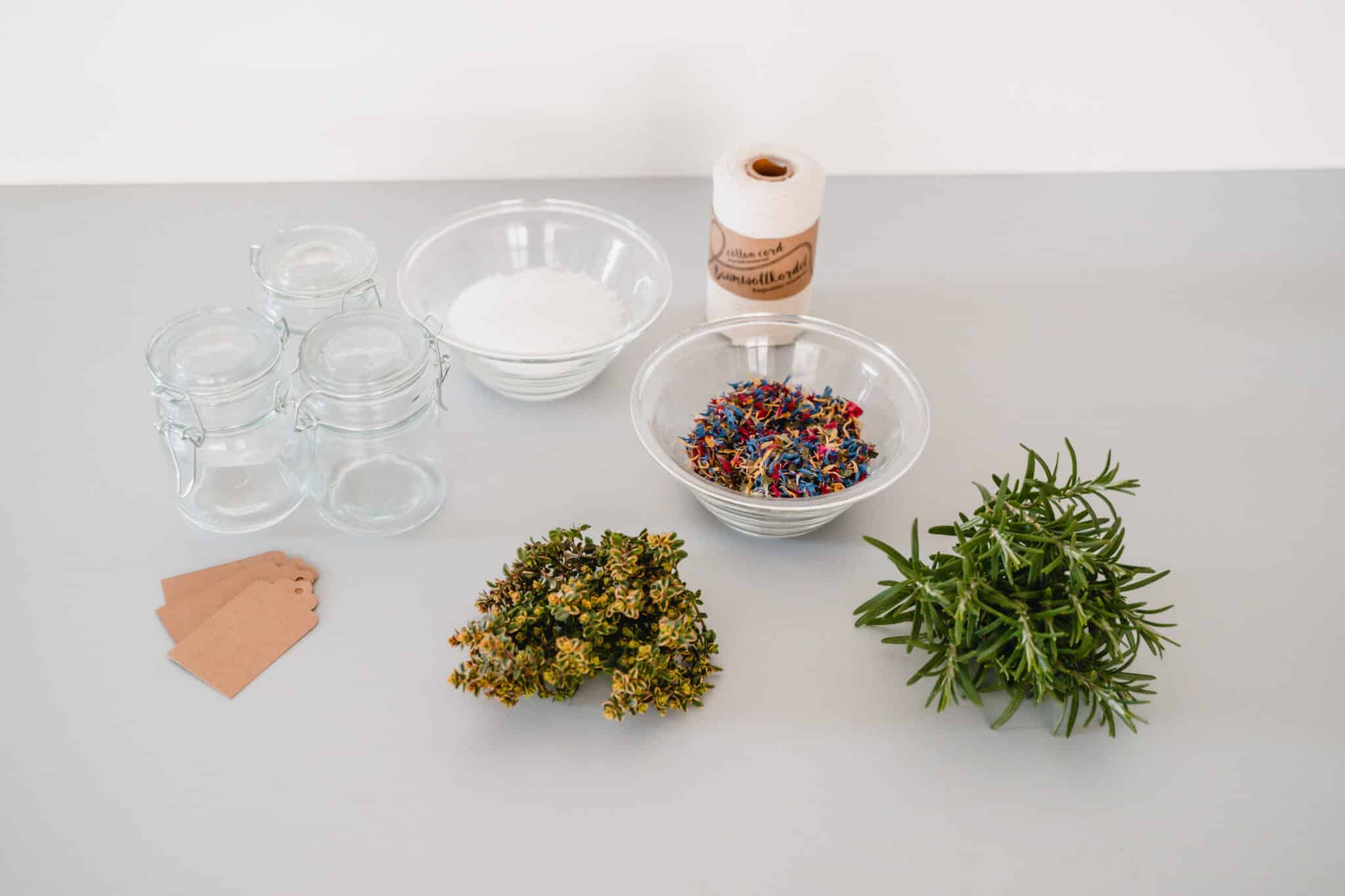 Verziere das Glas mit Band, einem Etikett und 1-2 essbaren Blumen. Beschrifte das Etikett mit «Blütensalz».