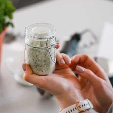 Entferne beim Rosmarin die einzelnen Blätter. Gib diese zusammen mit dem Salz in den Mixer.