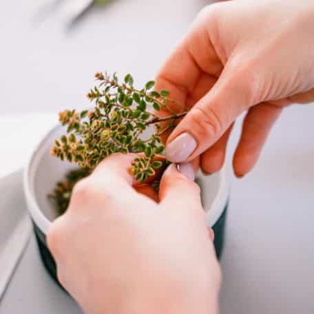 Verziere das Glas mit Band, einem Etikett und einem Thymianzweig. Beschrifte das Etikett mit «Thymiansalz».