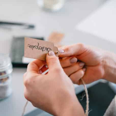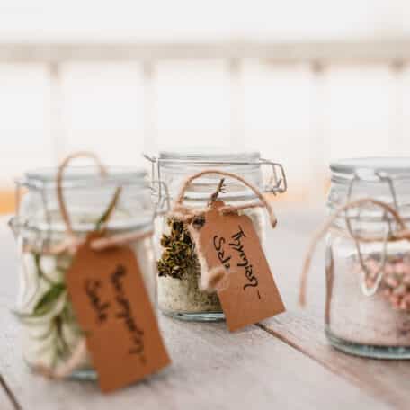 Verziere das Glas mit Band, einem Etikett und einem Rosmarinzweig. Beschrifte das Etikett mit «Rosmarinsalz».