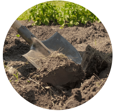 Man gräbt ein Loch, das doppelt so breit und tief ist wie der Wurzelballen des Baums und entfernt alle Unkräuter und Steine.