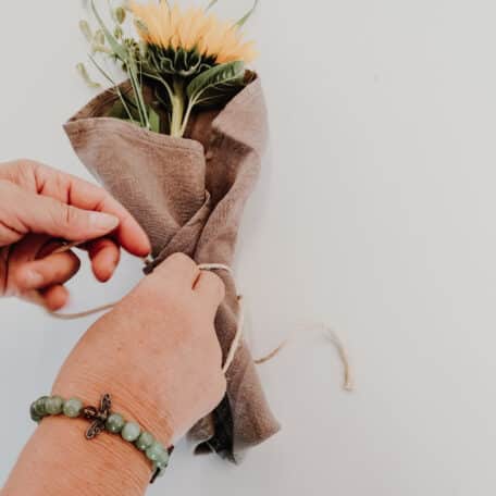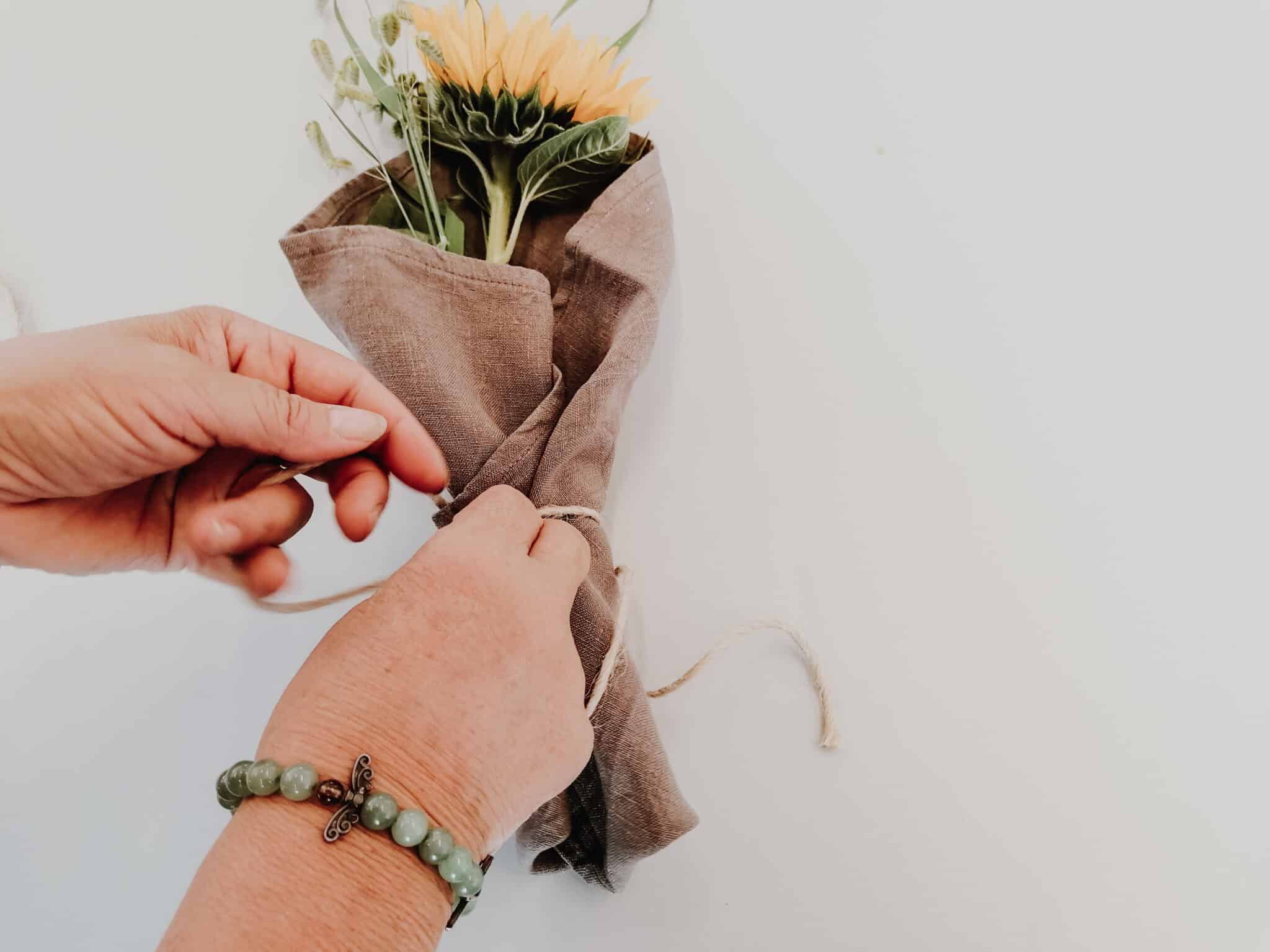Servietten falten, vorbereitete Sträusse hineinlegen und mit Schnur zusammenbinden.
