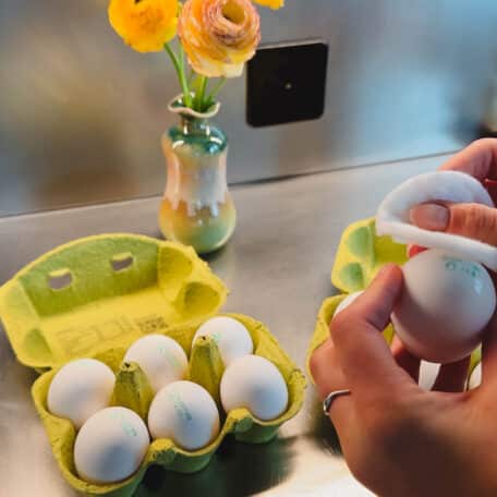 Entferne zunächst mit etwas Essig und einem Wattepad oder Haushaltspapier die aufgedruckte Schrift von den Ostereiern. Anschliessend die Eier für etwa 10 Minuten hart kochen.
