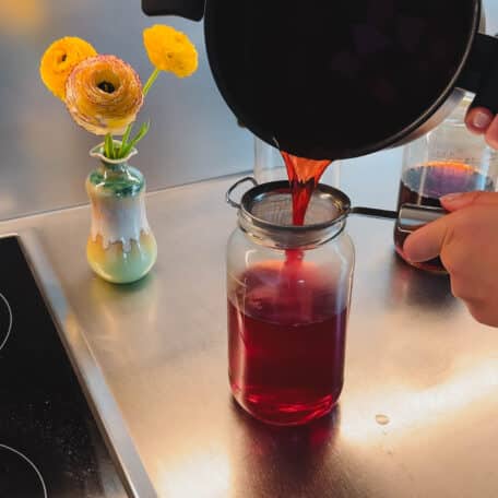 Giesse anschliessend die Suds durch ein Sieb in separate Glasgefässe – je eines für Randen, Zwiebeln und Kurkuma.