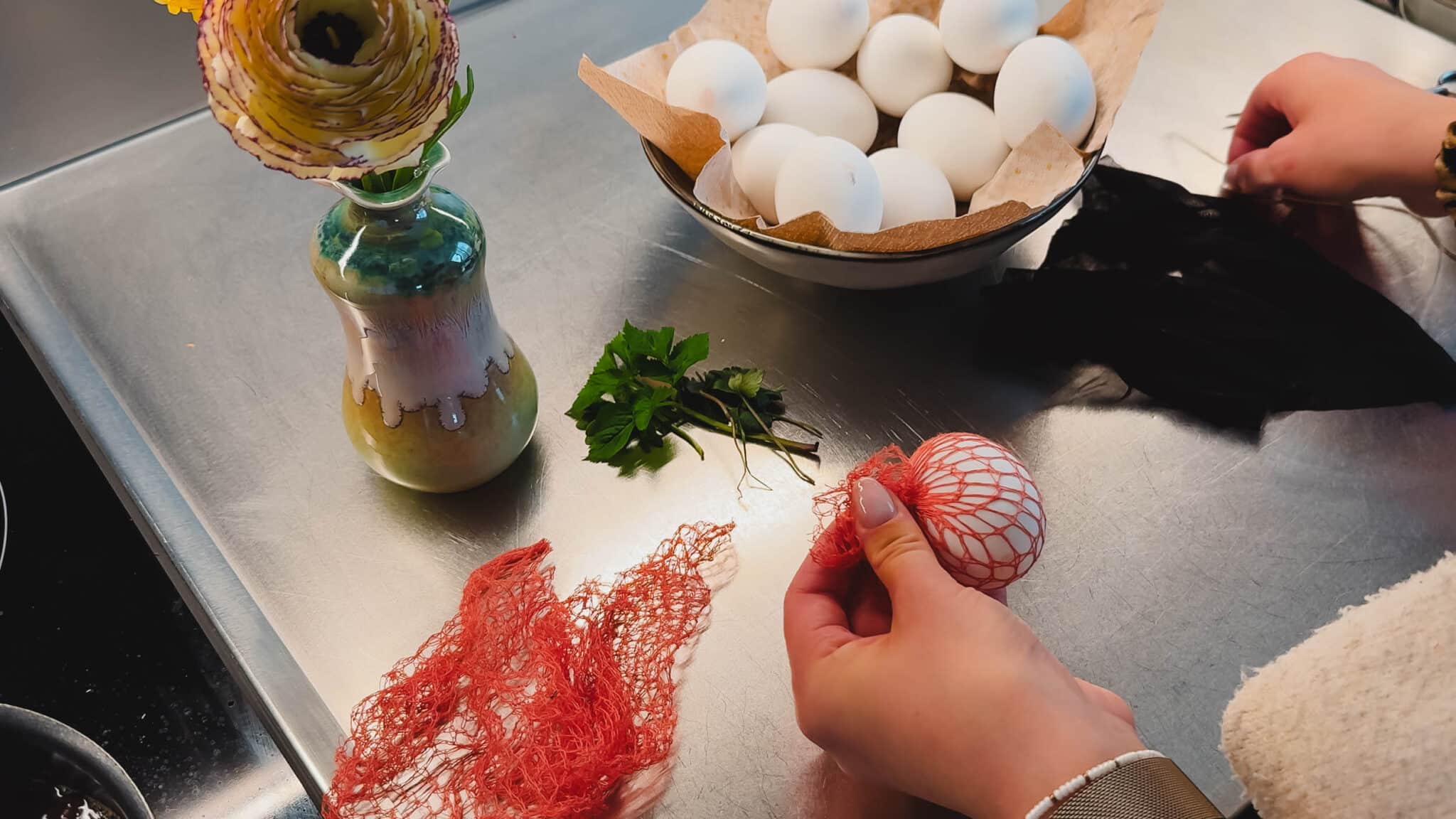 Für natürliche Muster kannst du kleine Blätter oder Blüten auf die Eier legen. Wickle die Eier dann in einen Nylonstrumpf und knote ihn gut zu – alternativ eignen sich auch Netzsäcke von Zwiebeln oder Knoblauch hervorragend.