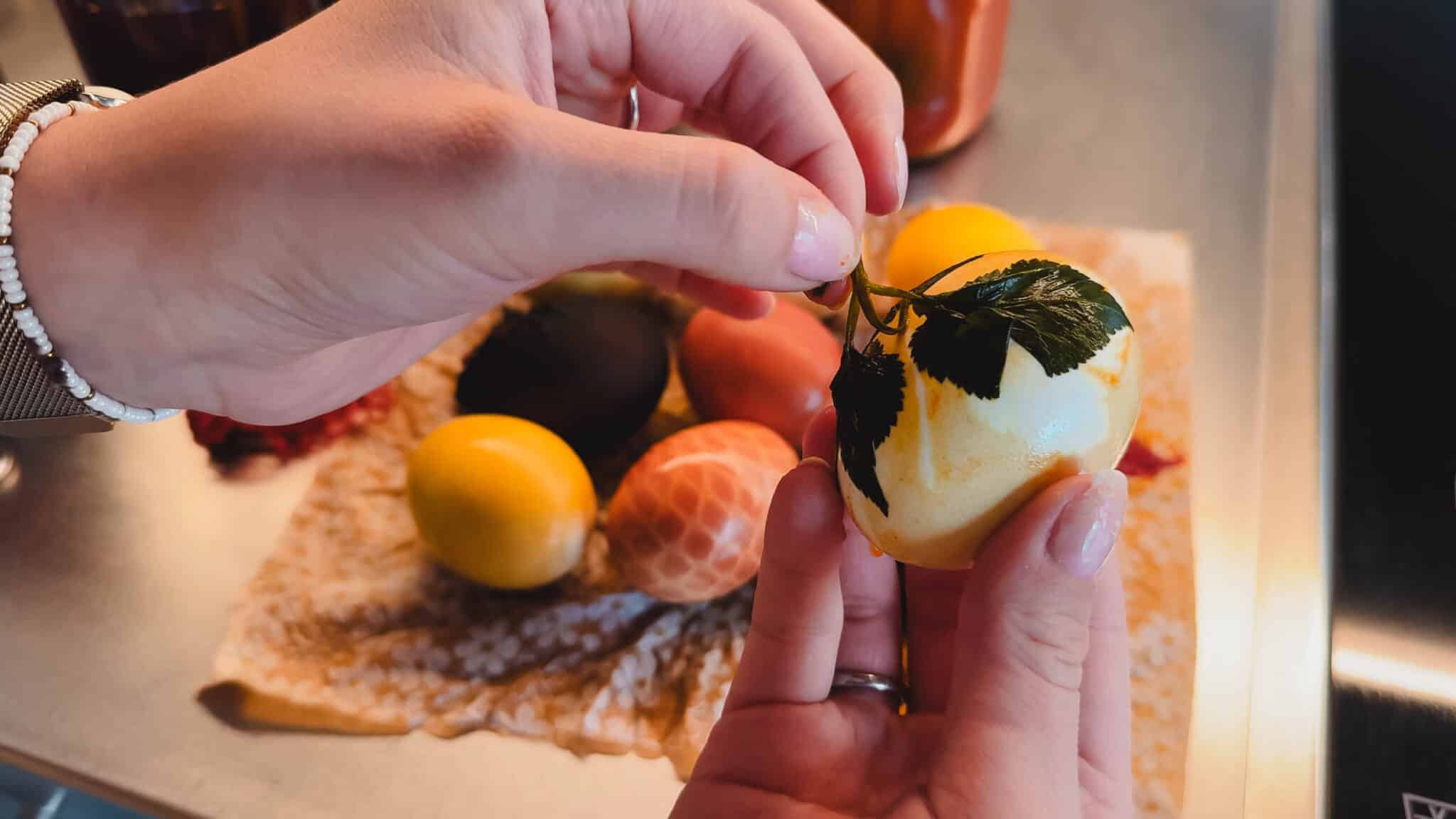 Sobald die Eier die gewünschte Farbe angenommen haben, lasse sie kurz trocknen. Für einen schönen Glanz reibe sie zum Schluss mit etwas Öl und einem Wattepad oder Haushaltspapier vorsichtig ein.