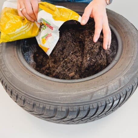 Erde in den Pneu füllen. Vergiss nicht, auch den Rand des Pneus mit Erde zu füllen.