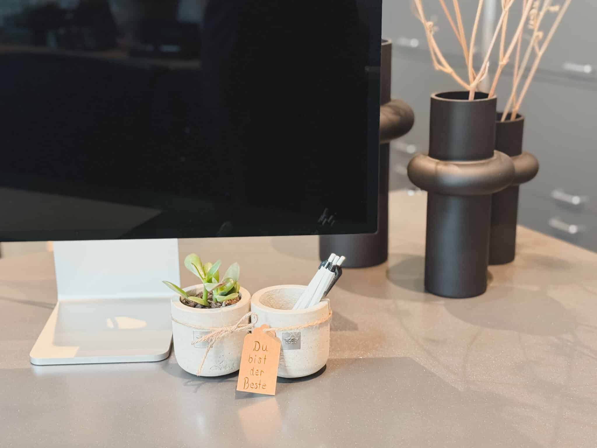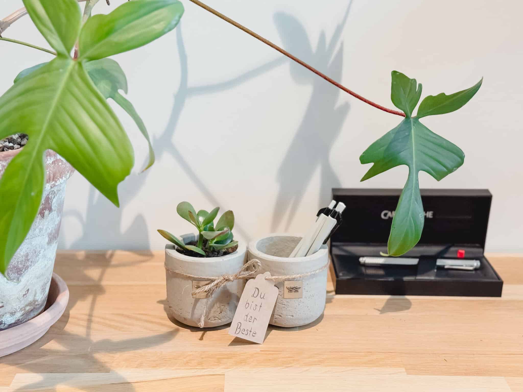 Natürlich kannst du nicht nur Kugelschreiber im Töpfchen platzieren, sondern auch Radiergummi, Büroklammern usw. Die Männerpflanze Bill ist übrigens ein Geldbaum (Crassula ovata), von dem man sagt, dass er zu Glück und Wohlstand verhilft.