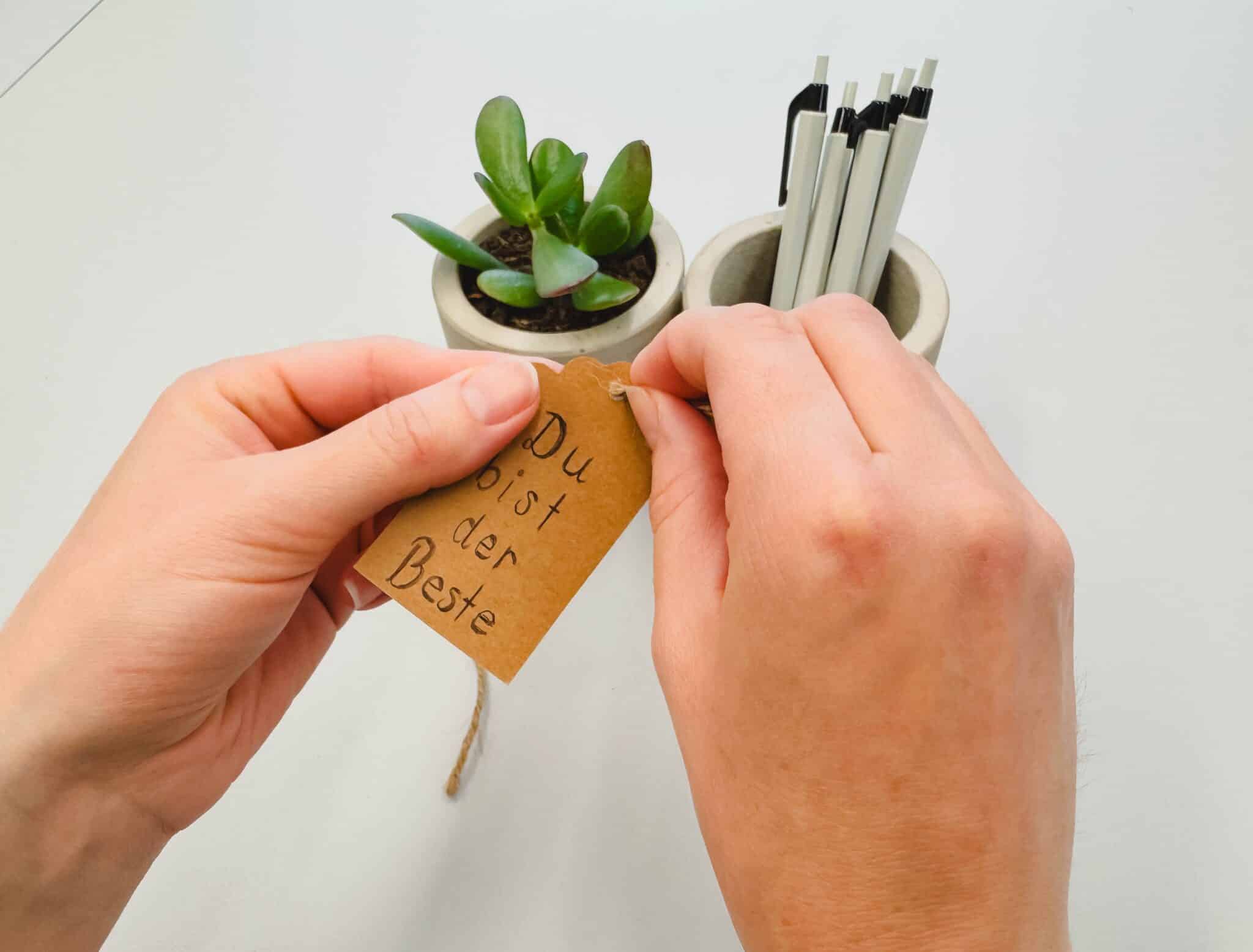 Schreibe eine liebevolle Botschaft auf die Etikette und befestige diese mit Schnur an den Gefässen.