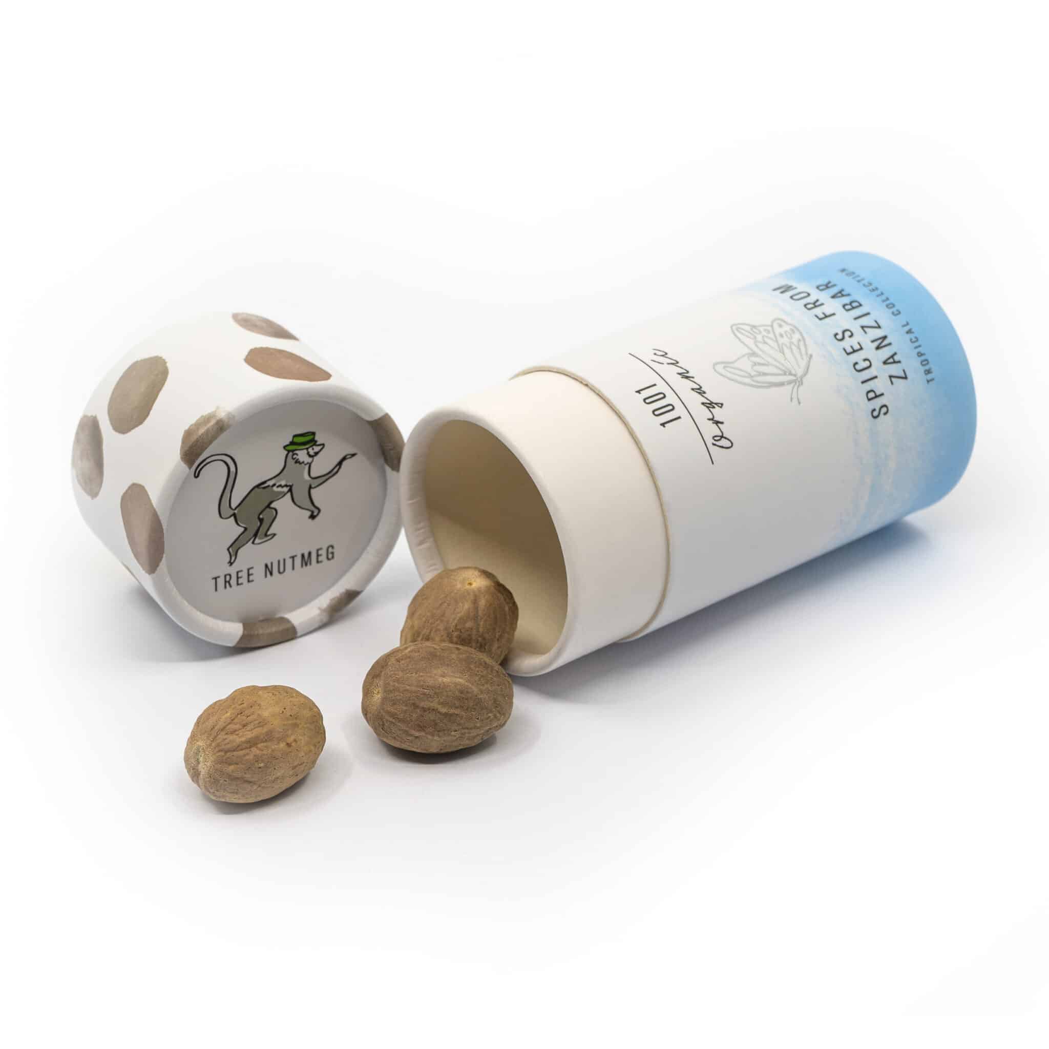 Muskatnuss: Der Muskatnussbaum ist ein immergrüner, bis zu 10 Meter hoher Baum mit wechselständigen, dunkelgrünen Blättern. Die reife Frucht ist cremegelb mit rötlichen Reflexen. Wenn sie reif ist, bricht sie auf und enthüllt den inneren Samen, der von einem leuchtend roten Kern umhüllt ist, der geschält und für Muskatblüte gemahlen wird. Auch wenn die Muskatnuss Nuss genannt wird, handelt es sich eigentlich um den Samen der Muskatnussfrucht. Reife Früchte werden gepflückt und auseinandergenommen, um sie von dem Samen (Muskatnuss) zu trennen. Die Muskatnuss mit den getrockneten Früchten wird dann von Hand geöffnet und die Muskatblüte, die die Nuss umgibt, wird entfernt. Diese wird entfernt, indem man mit einem kleinen spitzen Messer den Ansatz der Muskatblüte an der Basis der Muskatnuss abschneidet. Unsere Bauern sind nur auf der Insel Sansibar ansässig.