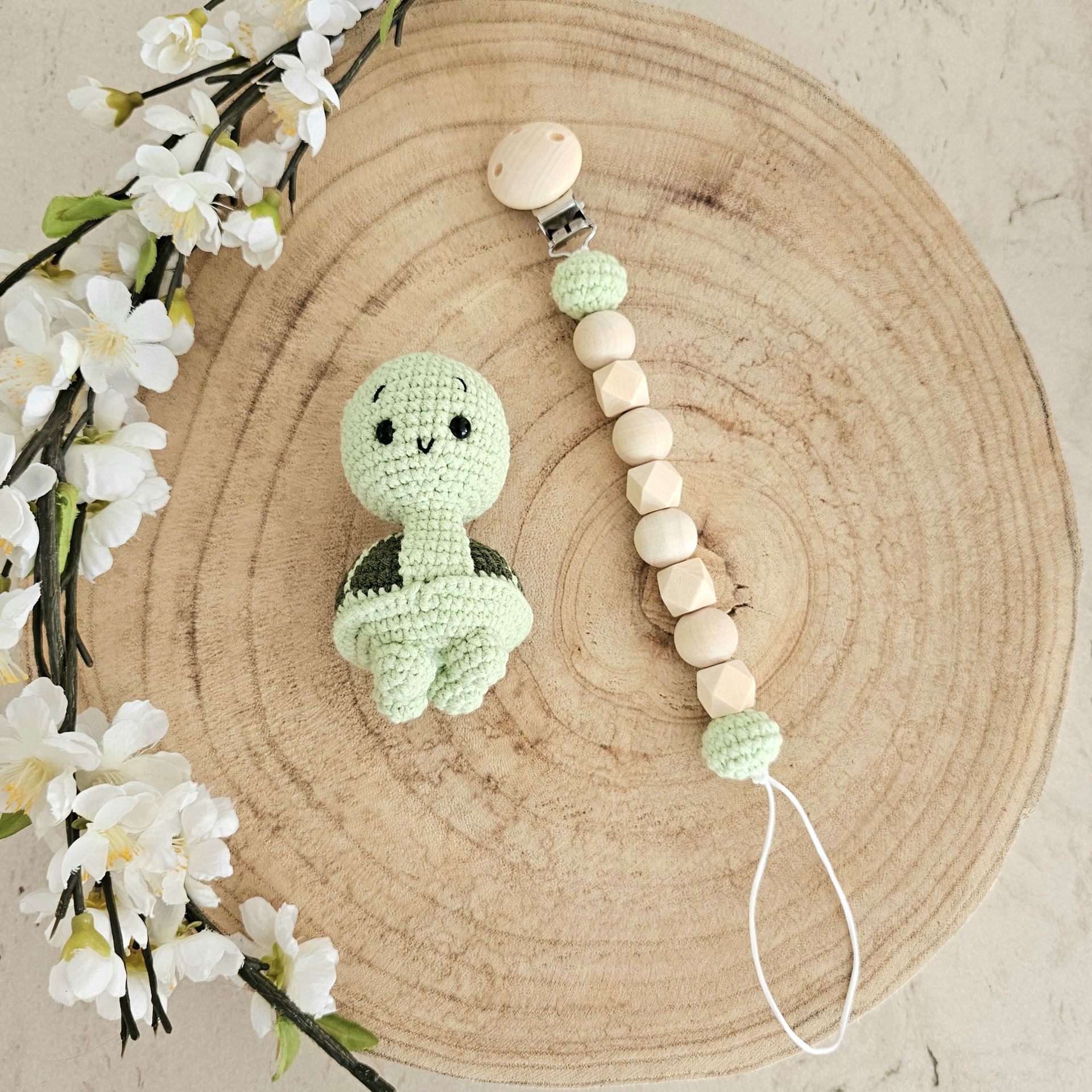 Unser 2er Set Schildkröte ist das ideale Geschenk zur Geburt, Taufe oder Babyparty. Es enthält eine Schnullerkette und ein Häkel Mini-Schildkröte.