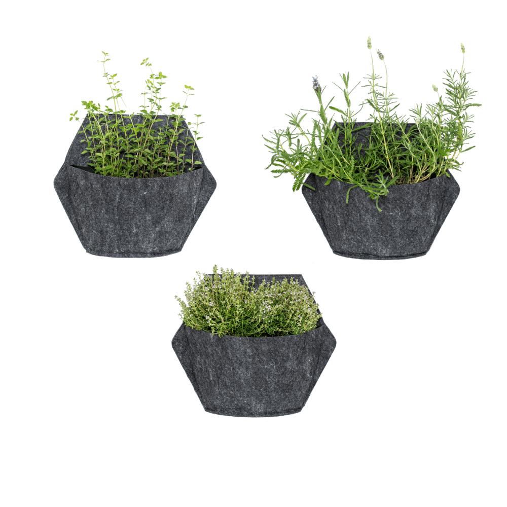– Wandpflanzgefäss mit sechseckigem Filzbezug. Innentöpfe in drei Farben erhältlich: Weiss, Schwarz und Grau.