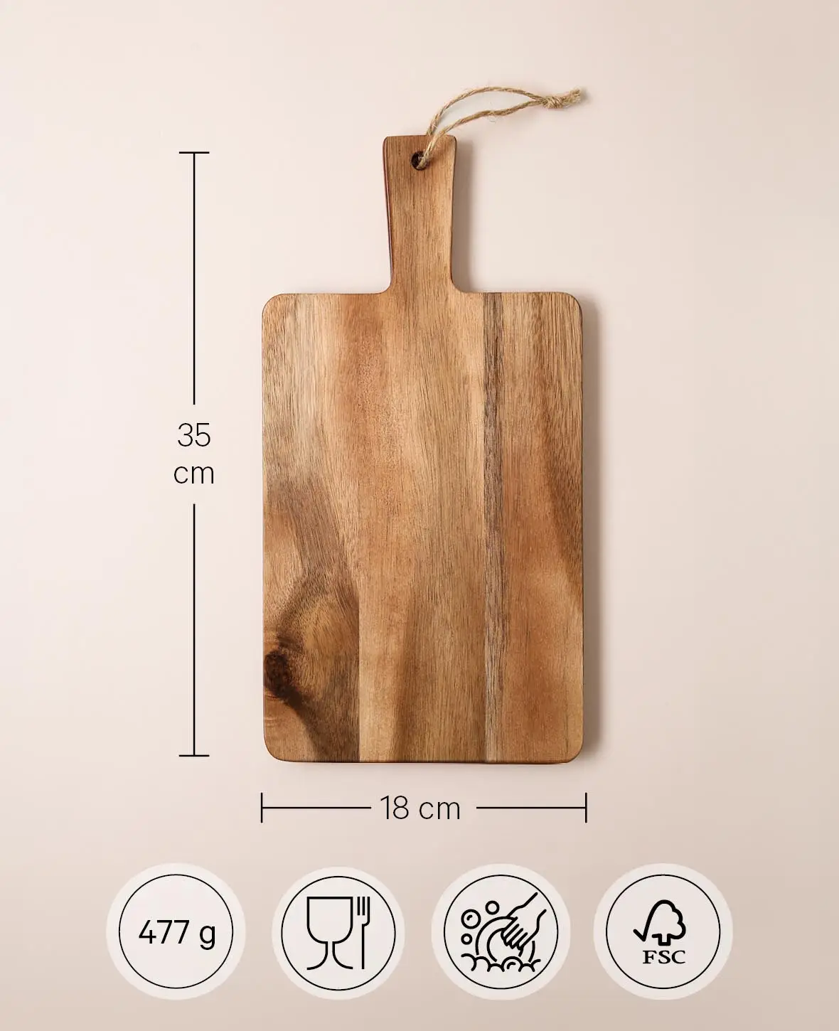 Eckiges Holzbrett / Schneidebrett aus Akazienholz mit Griff und Schnur, 35 cm x 18 cm