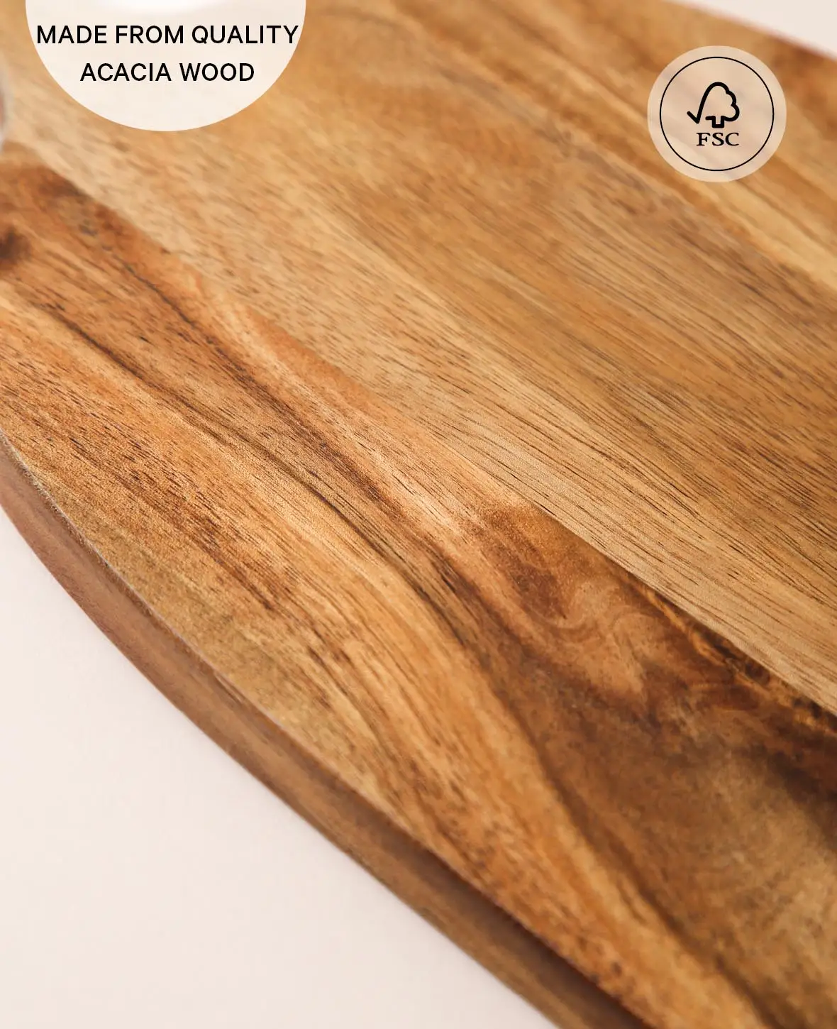 Entdecke unser charmantes ovales Holzbrett aus Akazienholz mit einem praktischen Griff! Perfekt zum Servieren oder Zubereiten von Speisen. Hergestellt aus robustem, pflegeleichtem Akazienholz, ist es lebensmittelecht und einfach von Hand zu spülen. Mit den Massen 45 cm x 19 cm ist dieses Brett nicht nur funktional, sondern auch ein stilvolles Accessoire für deine Küche.