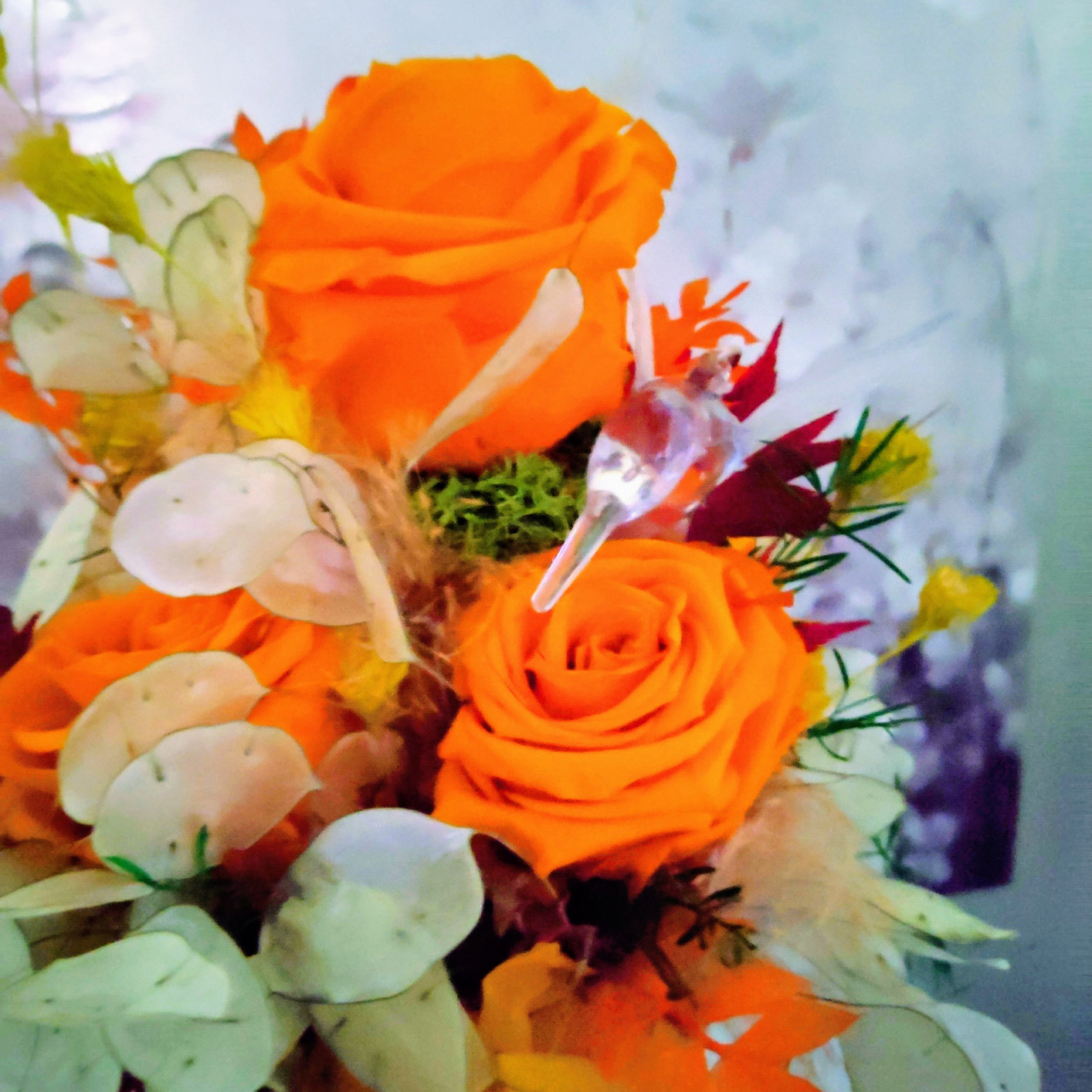 Hübsches Arrangement aus stabilisierten Rosen in Orangetönen in einer Glasschale, begleitet von getrockneten und stabilisierten Pflanzen, mit einem kleinen Glaskolibri. Dieses Arrangement wird dir oder deinen Lieben Freude bereiten.