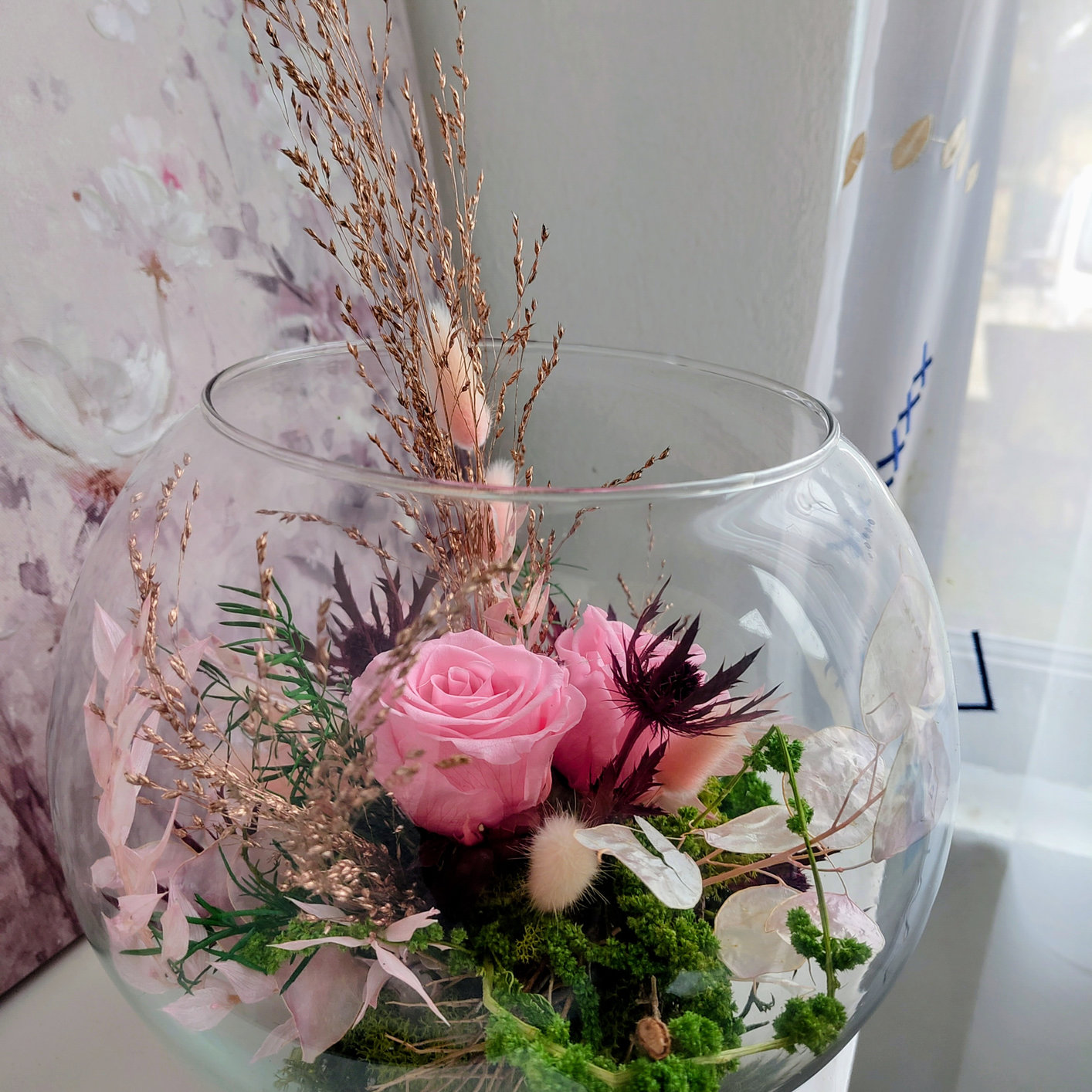 Wunderschöne Glasschale mit zwei stabilisierten Rosen, getrockneten und stabilisierten Pflanzen. Mehrere Jahre lang ohne Pflege haltbar – ein liebevolles Geschenk für einen Menschen, der dir am Herzen liegt.