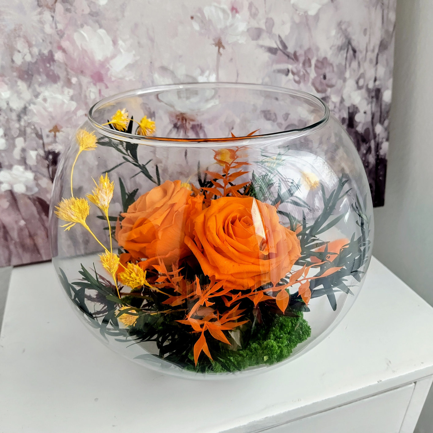 Wunderschöne Glasschale mit zwei orangefarbenen stabilisierten Rosen und getrockneten, stabilisierten Pflanzen. Mehrere Jahre lang ohne Pflege haltbar – ein Geschenk voller Zärtlichkeit und Liebe für einen Menschen, der dir am Herzen liegt.