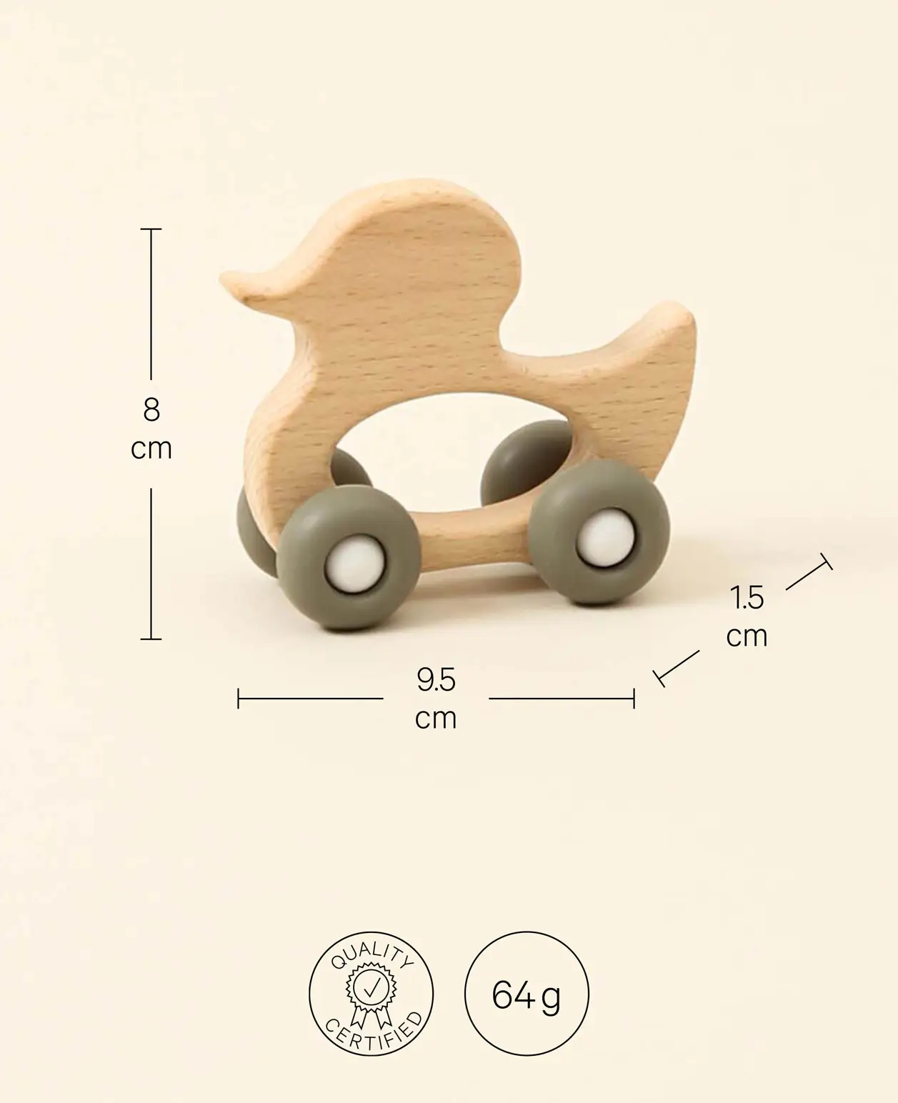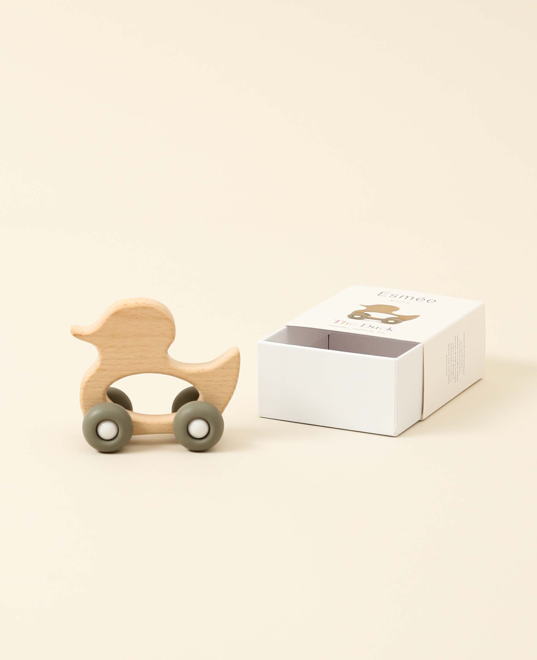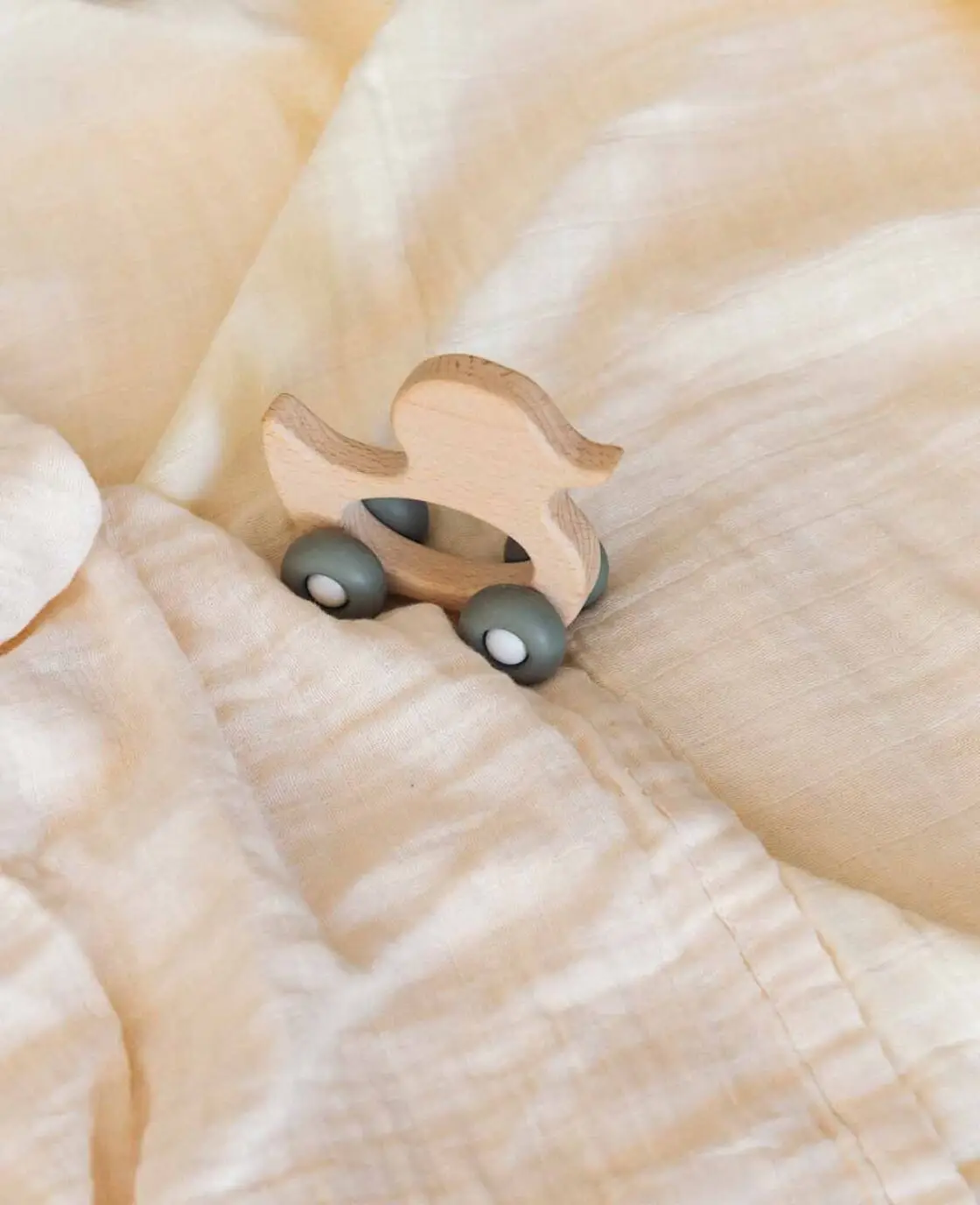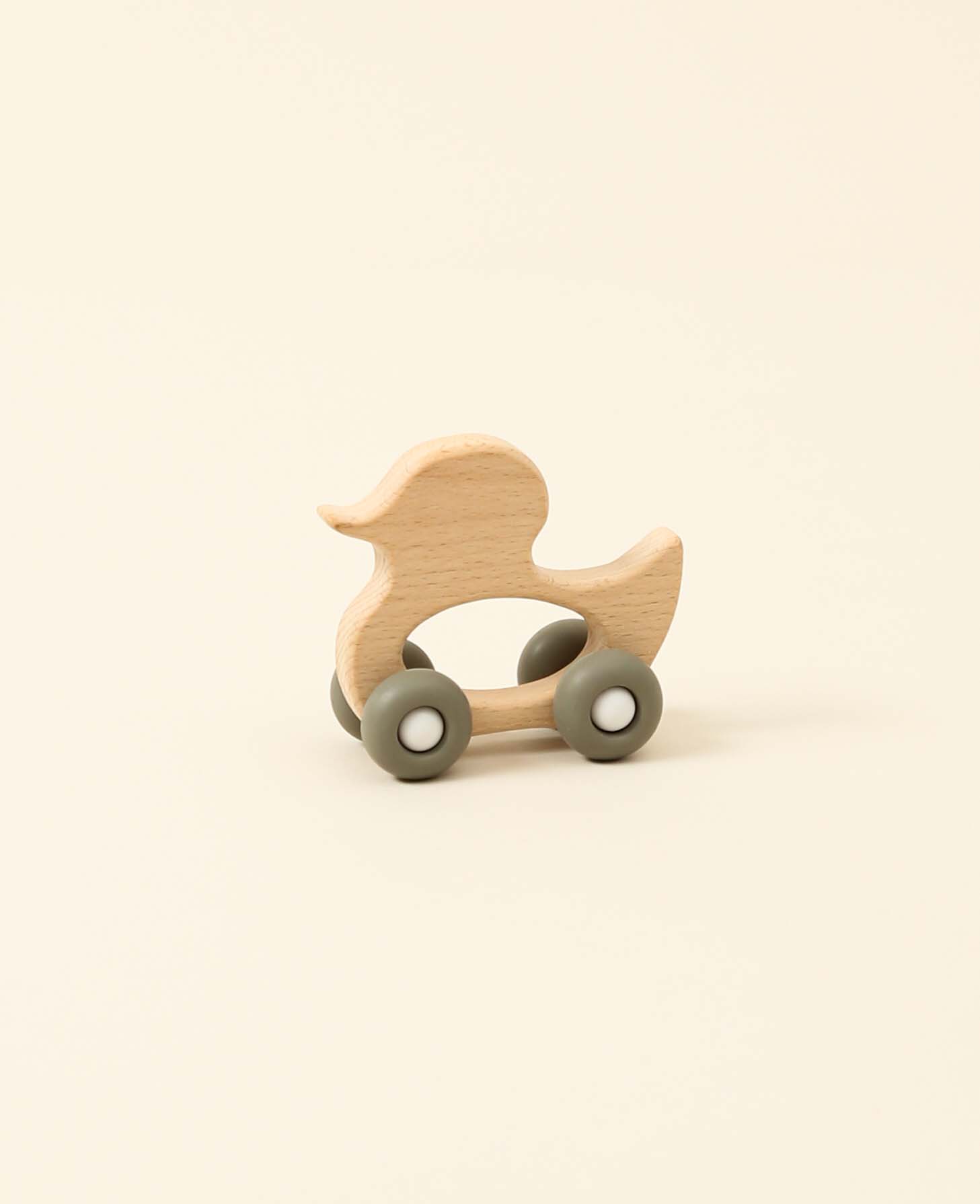 Holzente Beisspielzeug auf Rädern aus Buchenholz und Silikon, 9.5 cm