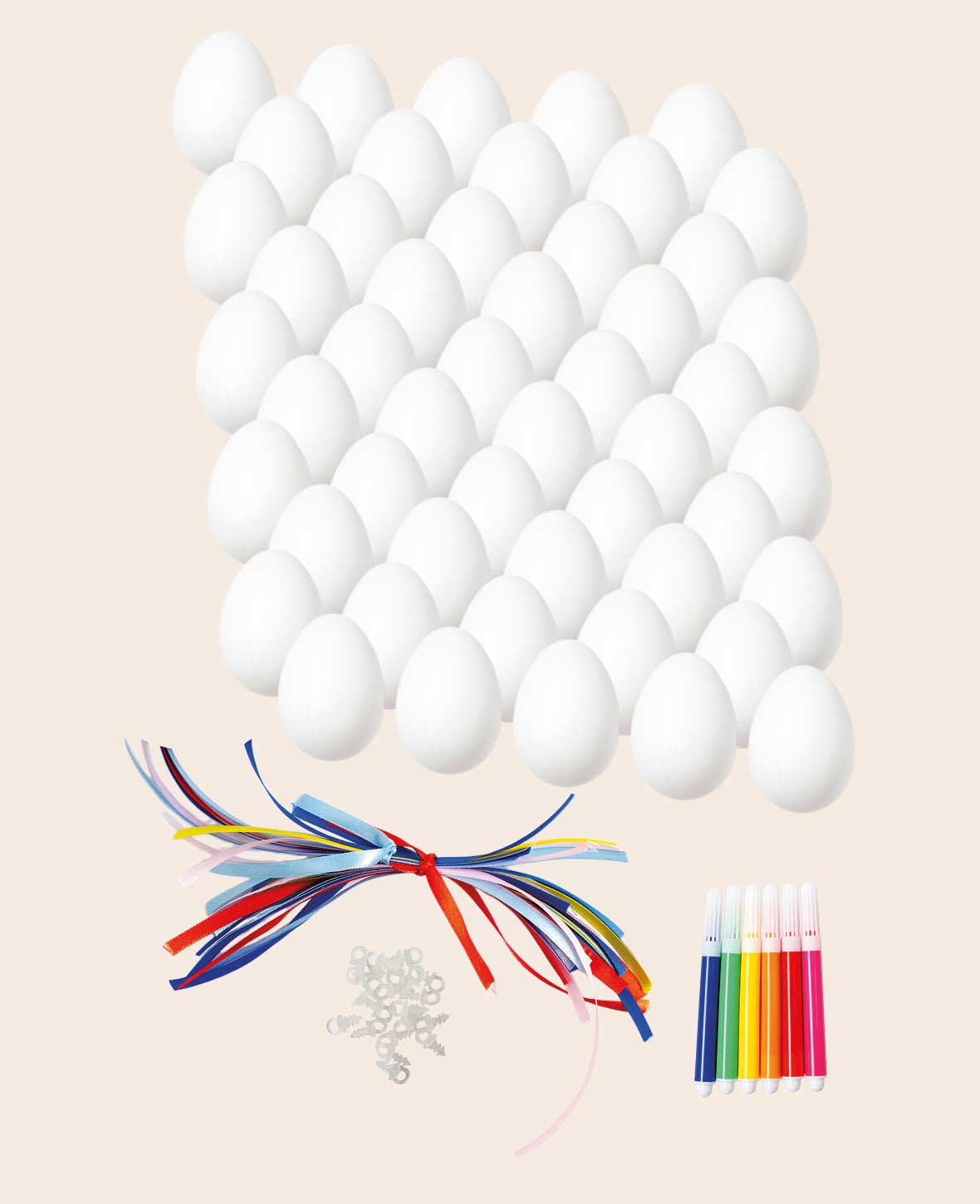 Dann ist dieses 50er Set mit Ostereiern genau das richtige. Denn da kannst du dich beim Dekorieren sowie Basteln austoben. Hinter diesem süssen Accessoire steckt nämlich ein do it yourself Projekt und bietet dir die Möglichkeit selbst zu entscheiden, wie es schlussendlich aussehen soll. Im Lieferumfang befindet sich neben den Ostereiern bunte Geschenkbänder, um die Eier danach aufhängen zu können, sowie Stifte für das Bemalen der rauen Oberfläche.