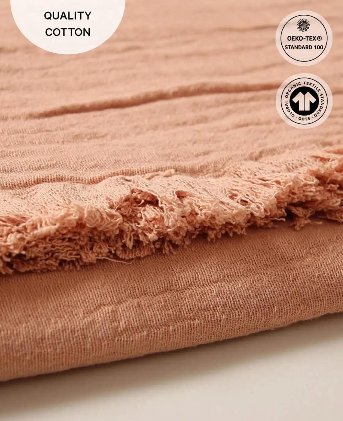 Unser schöner Bettüberwurf aus hochwertigem Baumwollmusselin zeichnet sich durch seine charakterlich gesteppte Struktur aus und setzt einen warmen, behaglichen Akzent als Bettüberwurf im Schlafzimmer aber auch als Kuscheldecke auf dem Sofa. Die farblich abgestimmten Fransen am Rand der Tagesdecke runden den Look wunderschön ab.