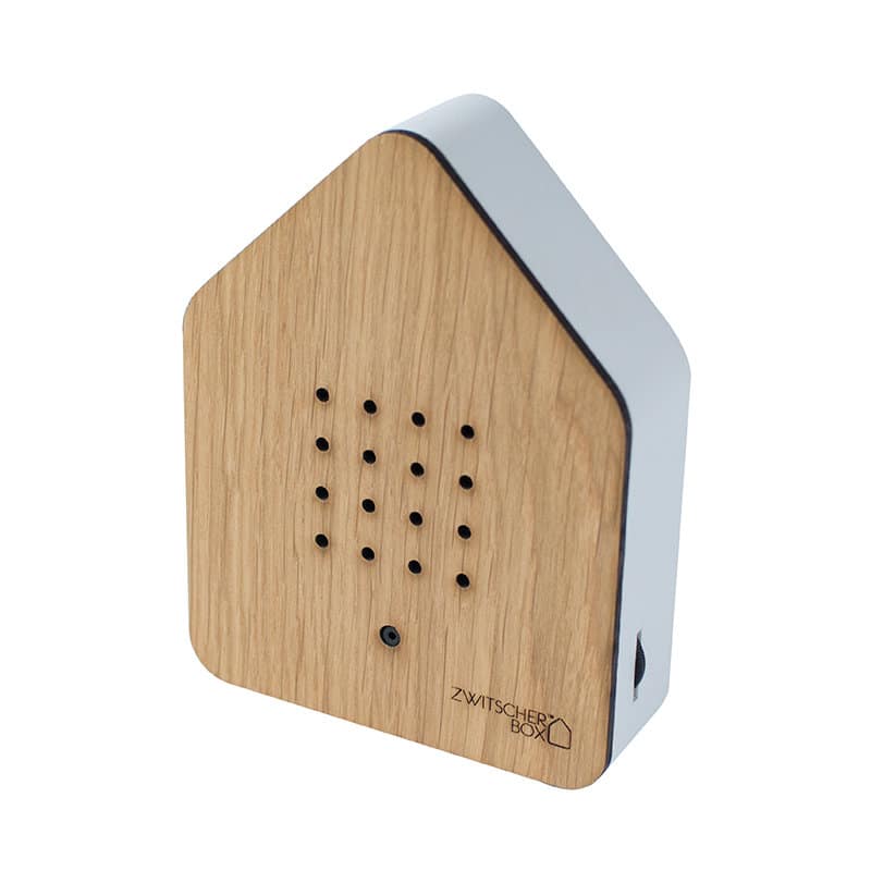 Erholung aus der Box. Die Natursounds der Zwitscherbox erschaffen eine wohltuende Soundkulisse, die uns intuitiv entspannen lässt. Ob zu Hause oder im Büro, das fröhliche Vogelgezwitscher lässt uns kurzfristig in eine Welt ohne Stress und Zeitdruck abtauchen. Wir atmen durch und kommen zur Ruhe, wie bei einem Waldspaziergang: Wir hören den erfrischenden Gesang der Vögel, unser Blick wird weich und der Atem tiefer. Das ist gesund für Geist und Körper! Die Zwitscherbox kann überall aufgestellt oder an die Wand gehängt werden. Das Zwitschern wird durch einen Bewegungsmelder aktiviert. Kommt kein neuer Impuls, verklingt der Sound nach ca. zwei Minuten wieder. Mit dem kleinen Rädchen an der Seite kann die Lautstärke eingestellt, oder die Zwitscherbox auch ausgeschaltet werden. Betrieben wird die Zwitscherbox von drei handelsüblichen AA-Batterien, die nach Abschrauben der Rückplatte ausgewechselt werden können.