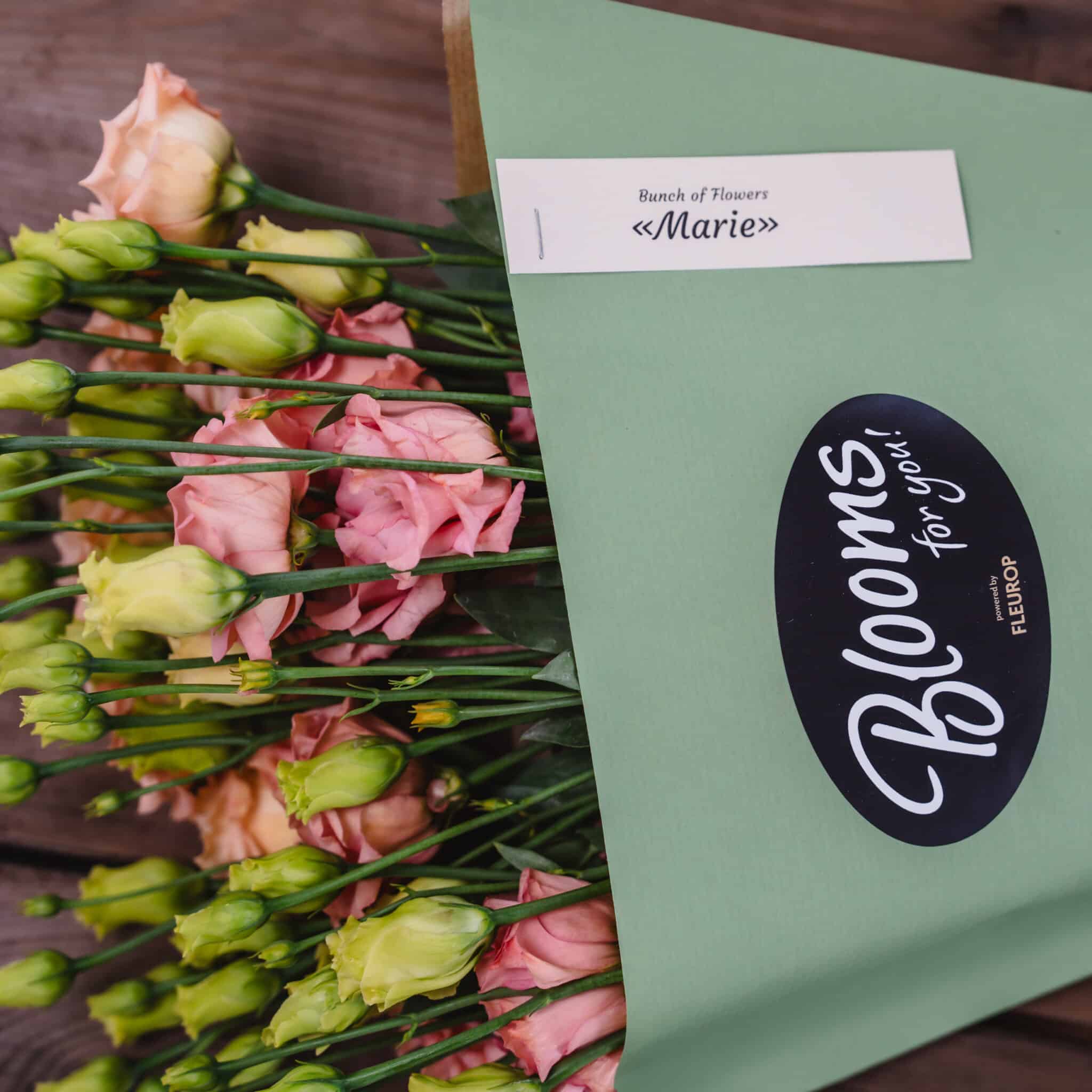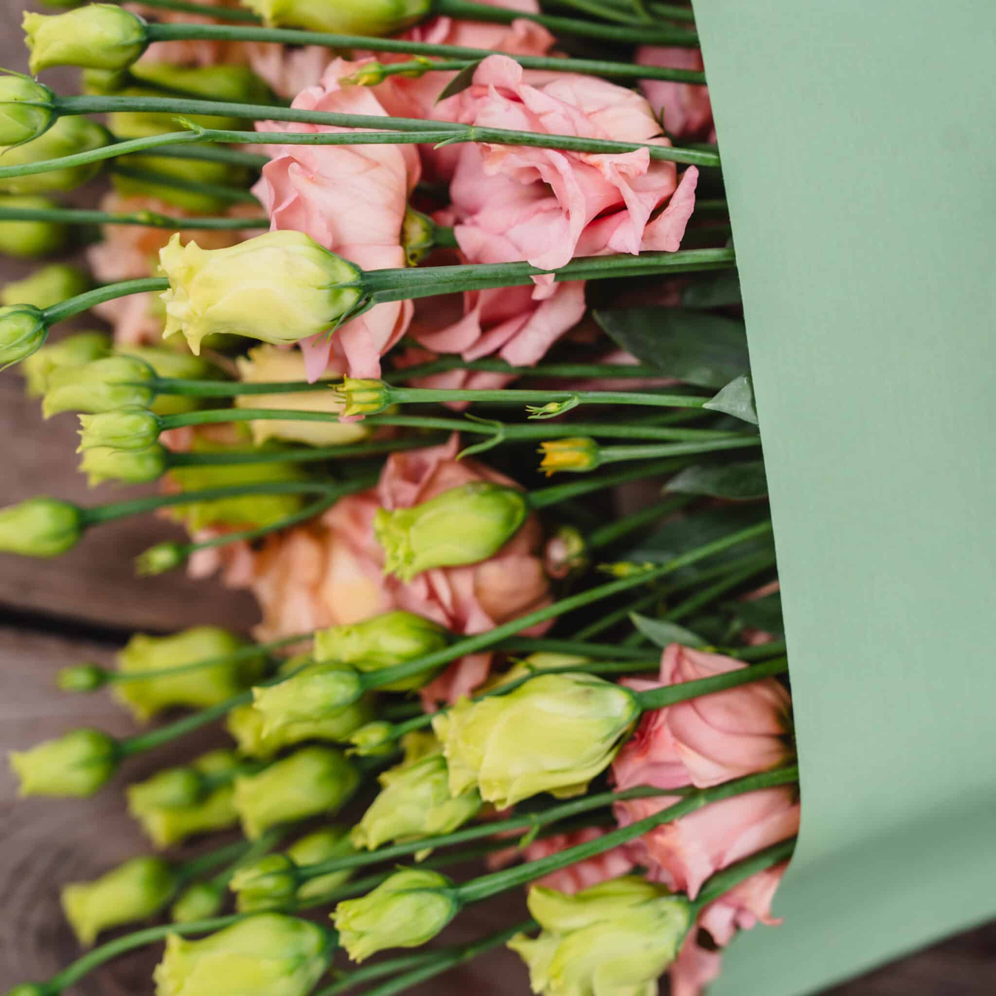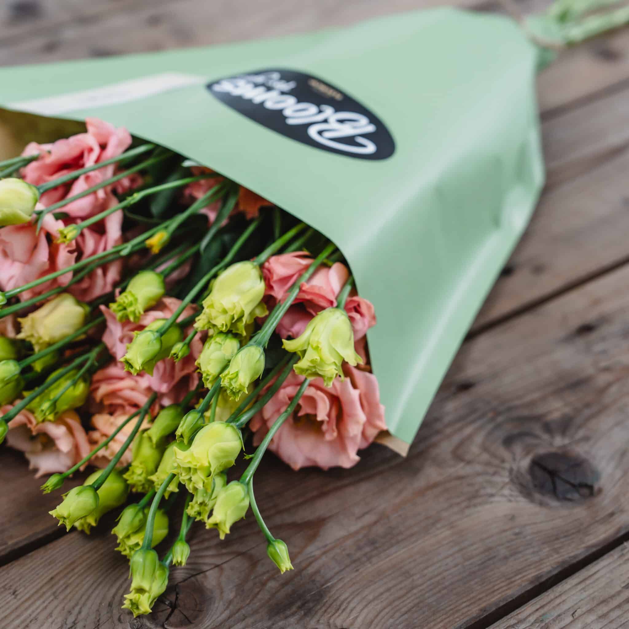 Lisianthus in Lachs (5 Stiele), in Misty Green Blumentüte